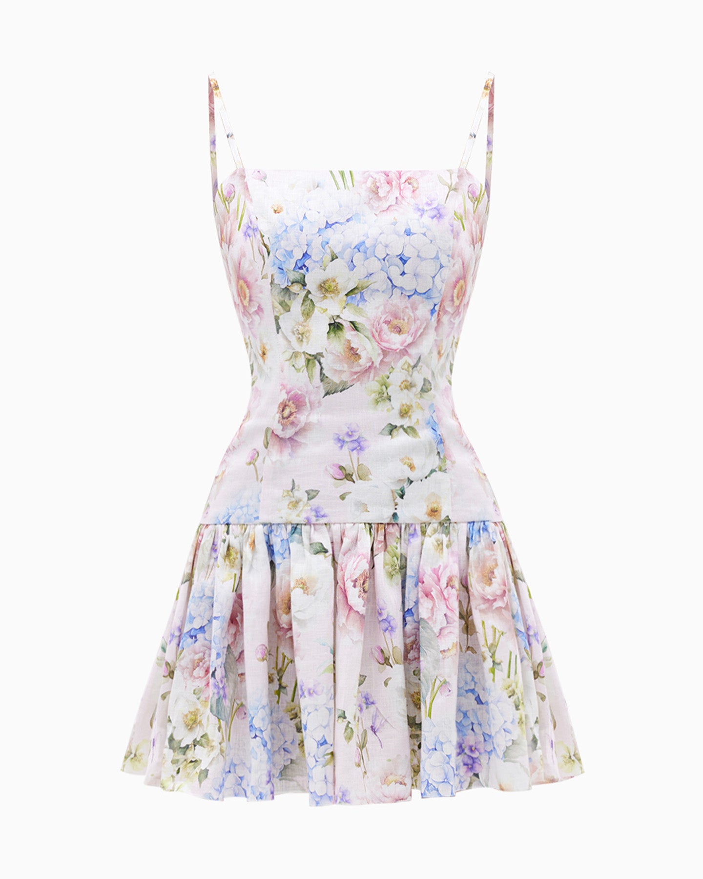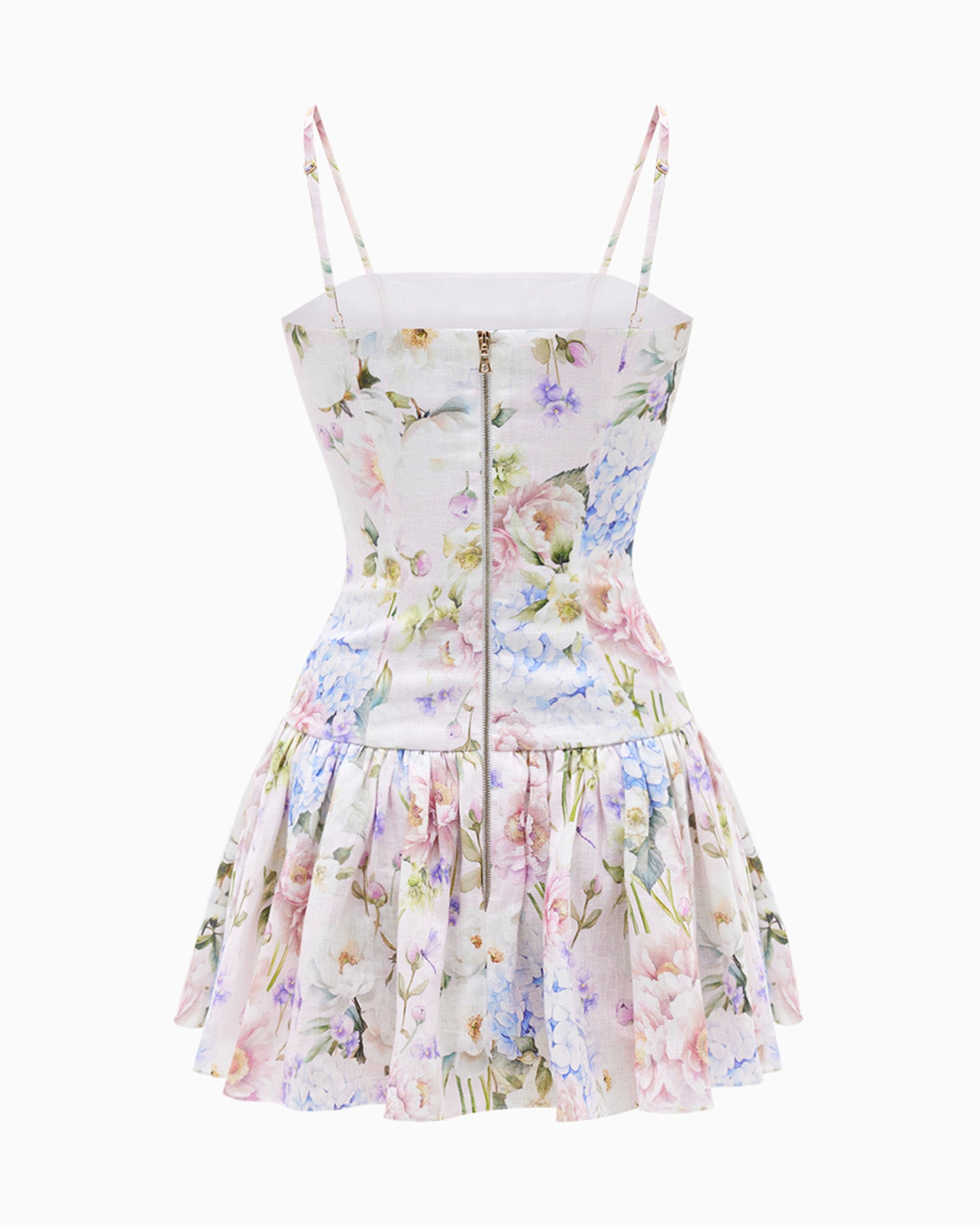 A delicate floral print, cinched waist, thin straps, and a flared skirt create a refined silhouette, making it perfect for both everyday outings and special occasions.