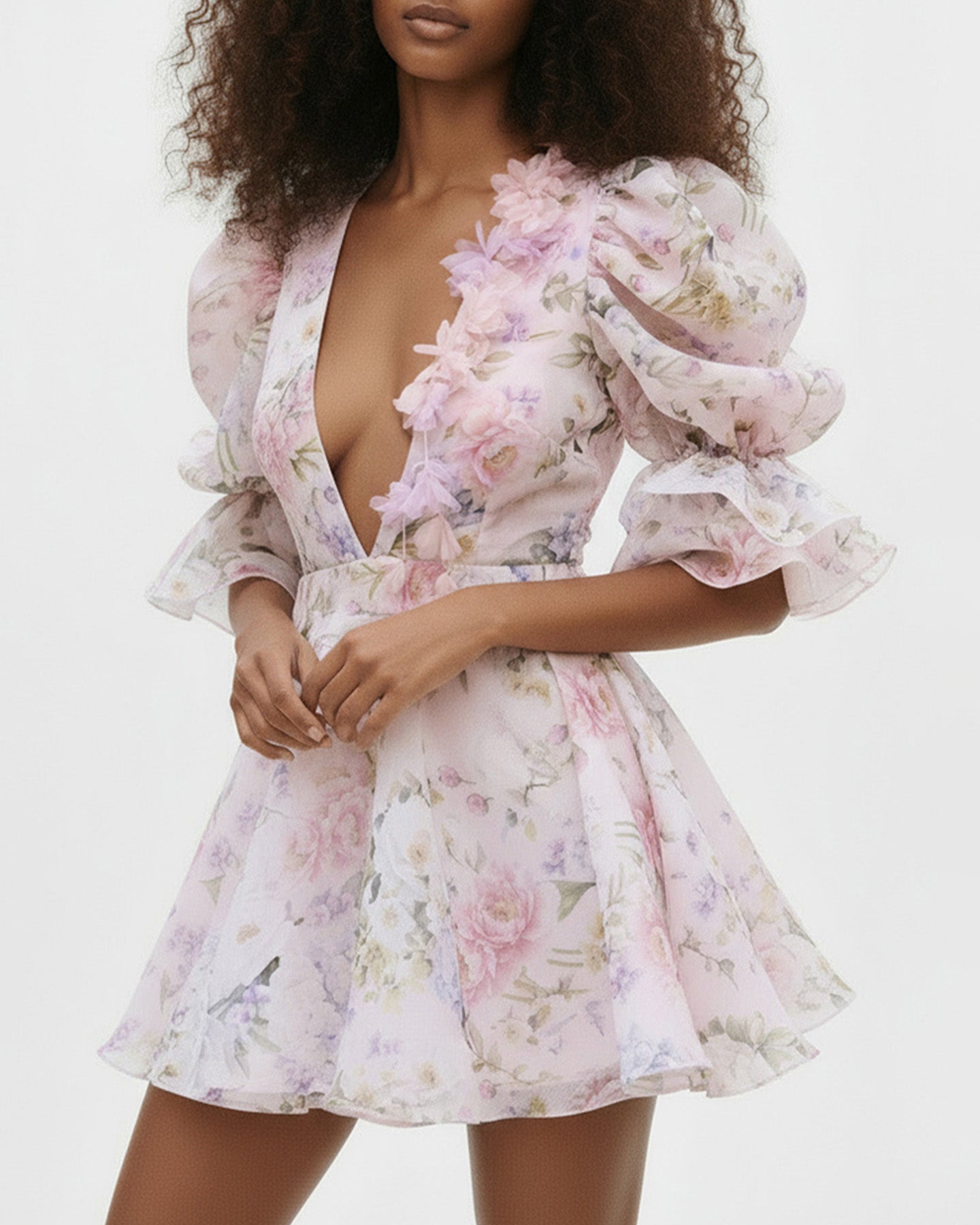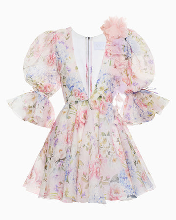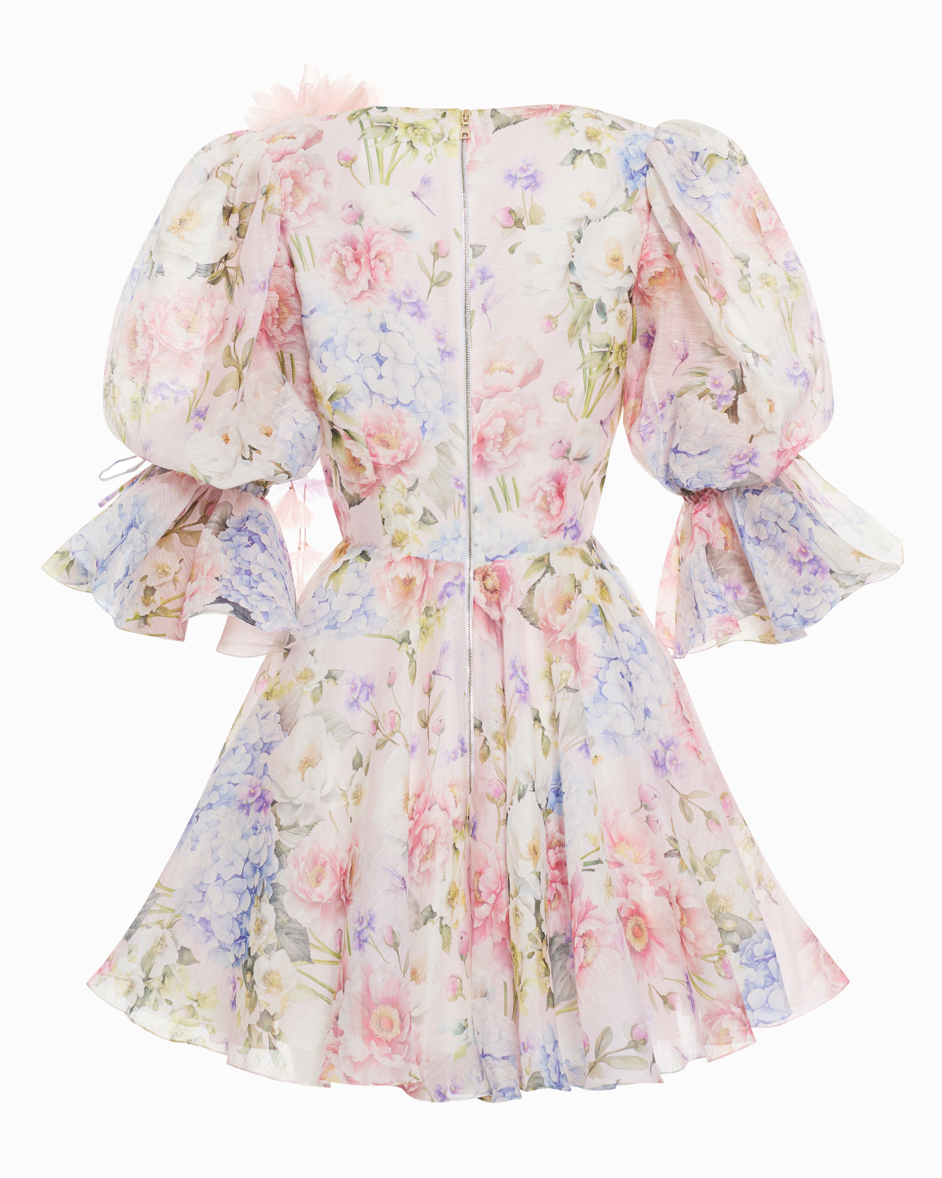 A deep V-neckline and voluminous puff sleeves add elegance and playfulness, highlighting femininity. A distinctive detail — removable floral accents, easily fastened or detached with discreet clasps — allows you to transform the look from soft and romantic to understated and refined.