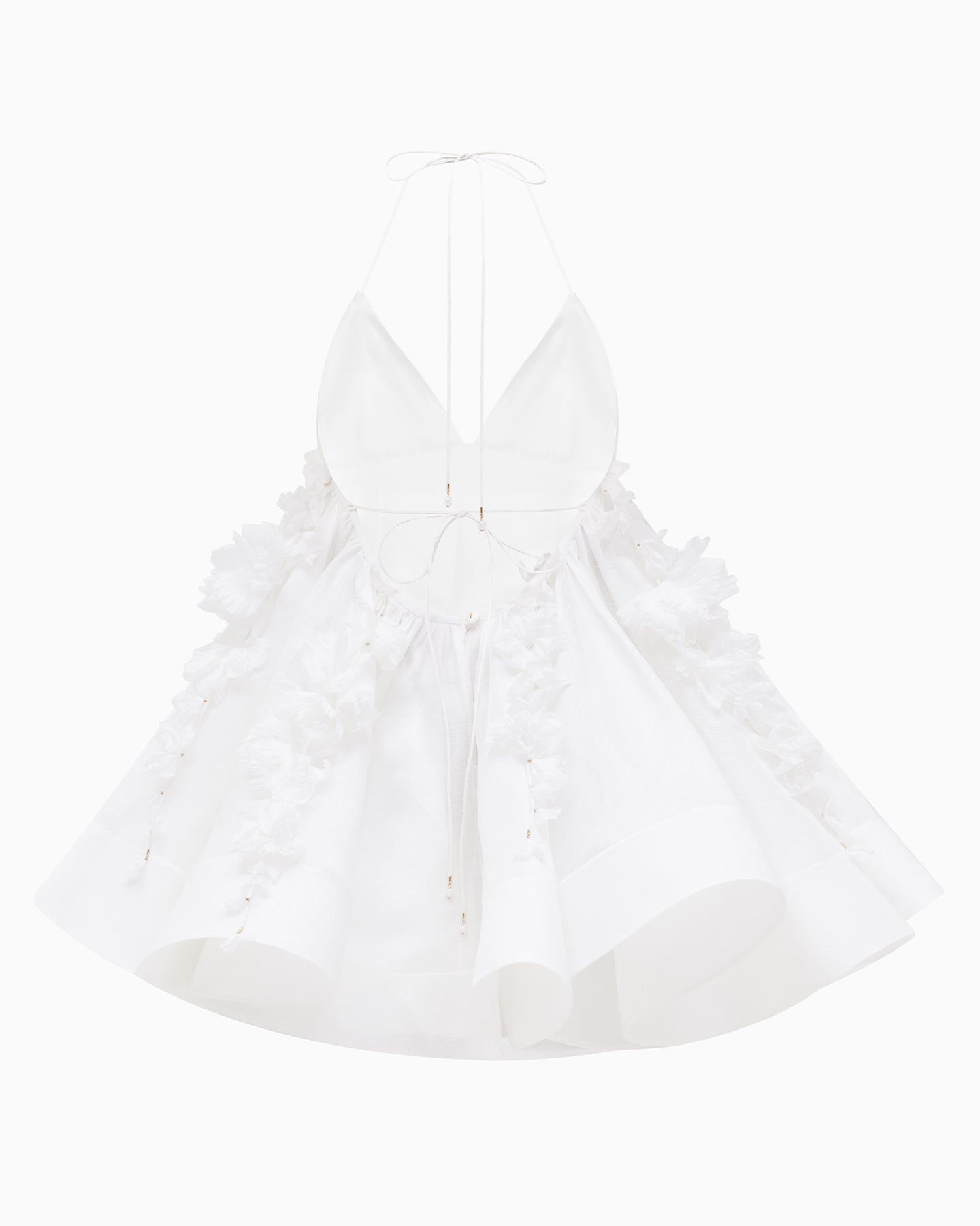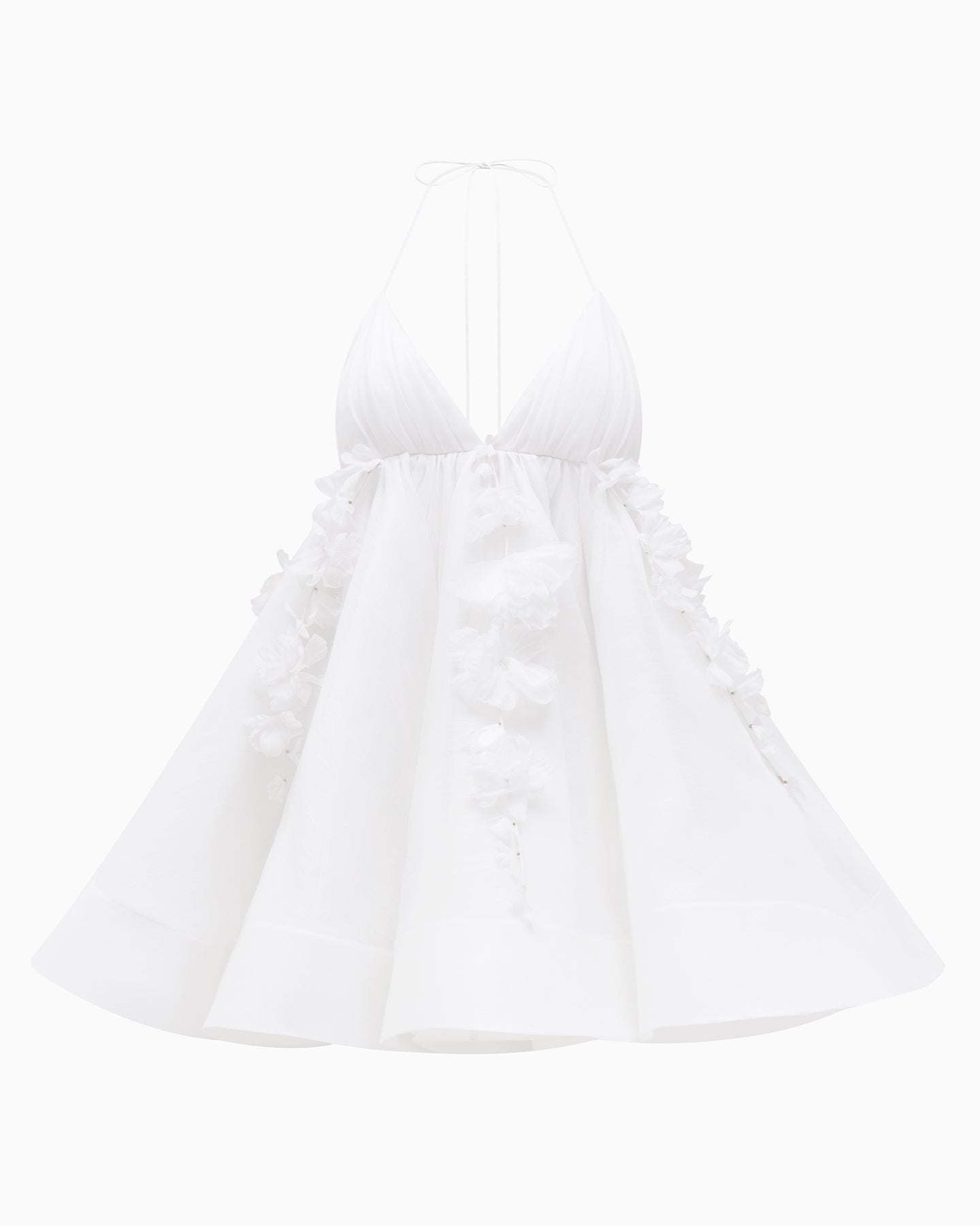 A bodice with delicate straps and an open back creates a romantic, playful silhouette, while a signature detail — flowers gracefully fastened beneath the bodice — cascade gently, adding refinement and softness to the look.