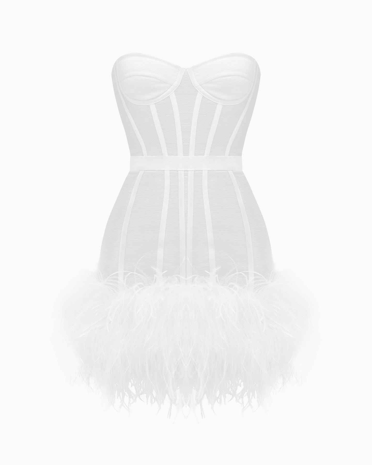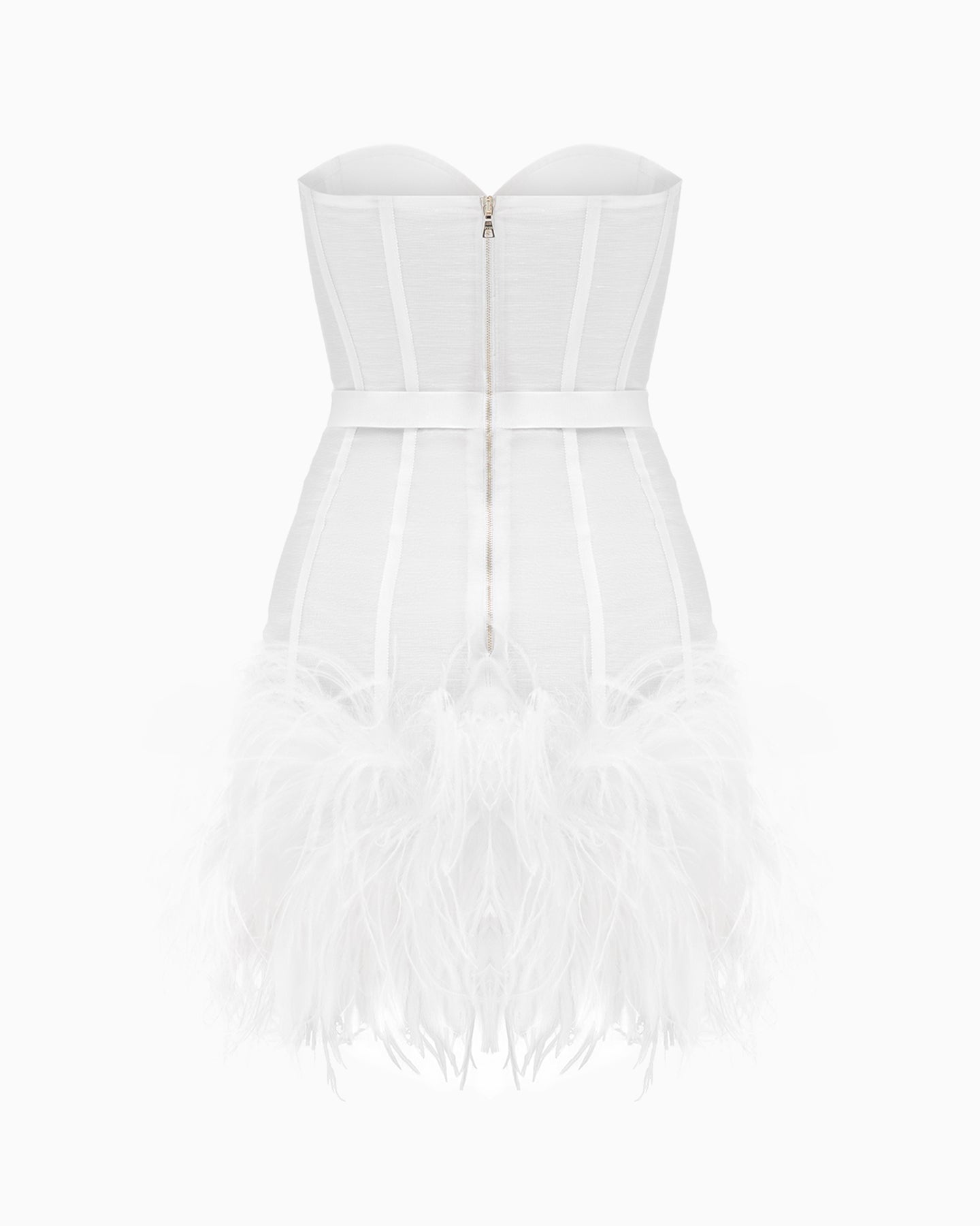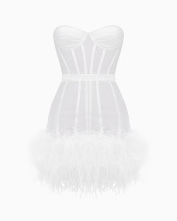Exquisitely crafted from luxurious linen-silk, the MAGNOLIA ALEXANDRINA dress highlights the figure with its corseted construction and defined waist. A feather-adorned skirt completes the look, creating a strikingly cinematic silhouette.