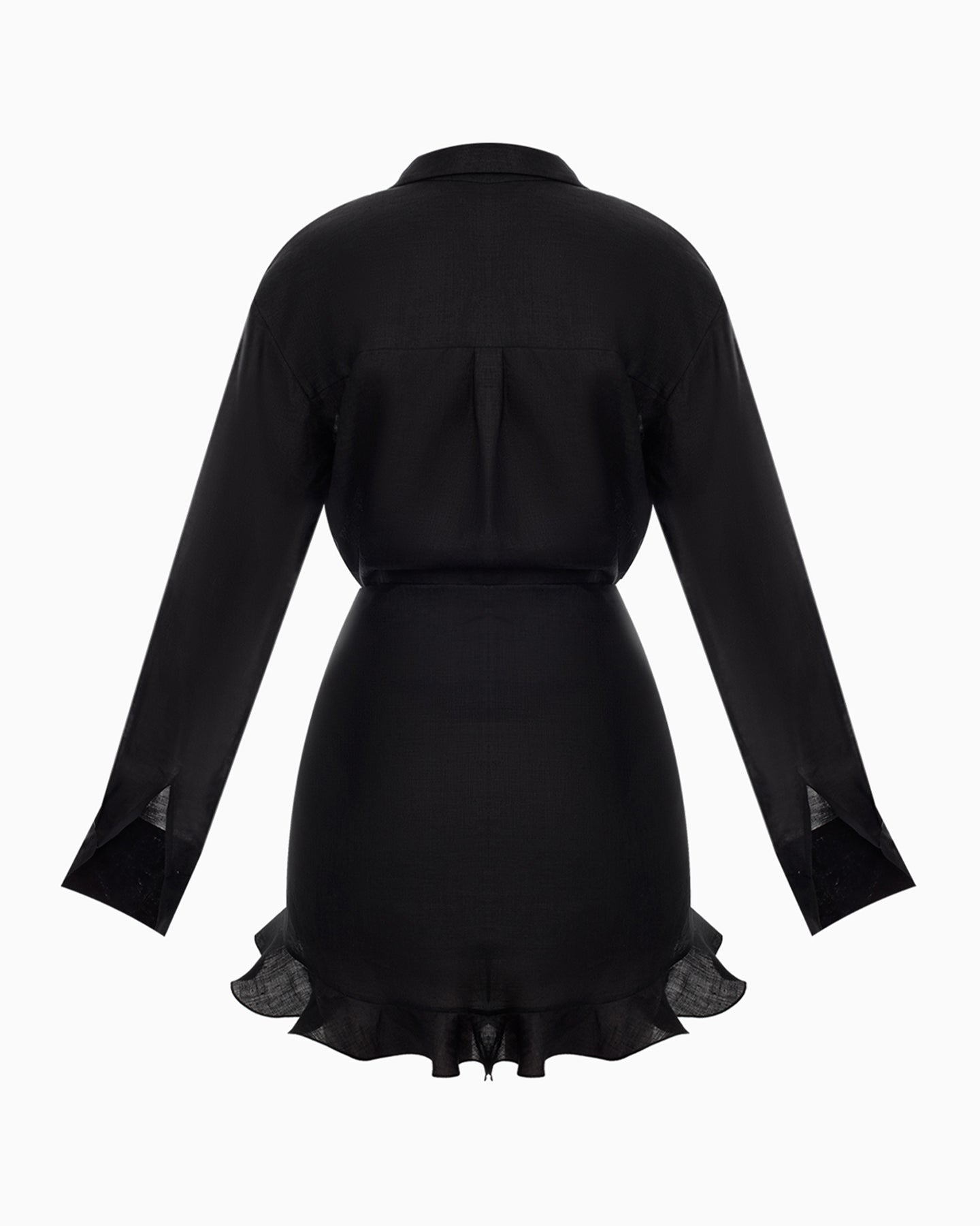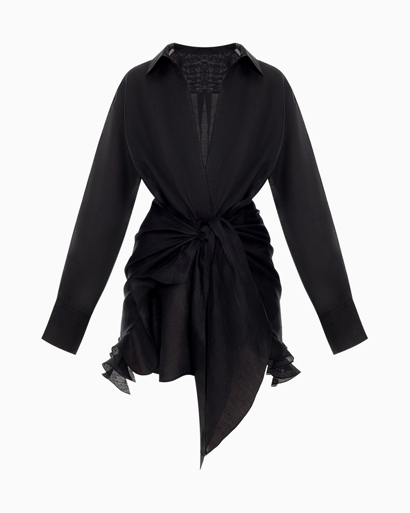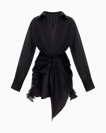This shirt dress made from premium black linen is perfect for evening outings or city strolls. The lightweight, breathable linen offers comfort, while the relaxed fit with a belt gently accentuates the waist without restricting movement. Elegant draping with a knot at the waist and a ruffled hem add a stylish refinement and effortless charm to the look