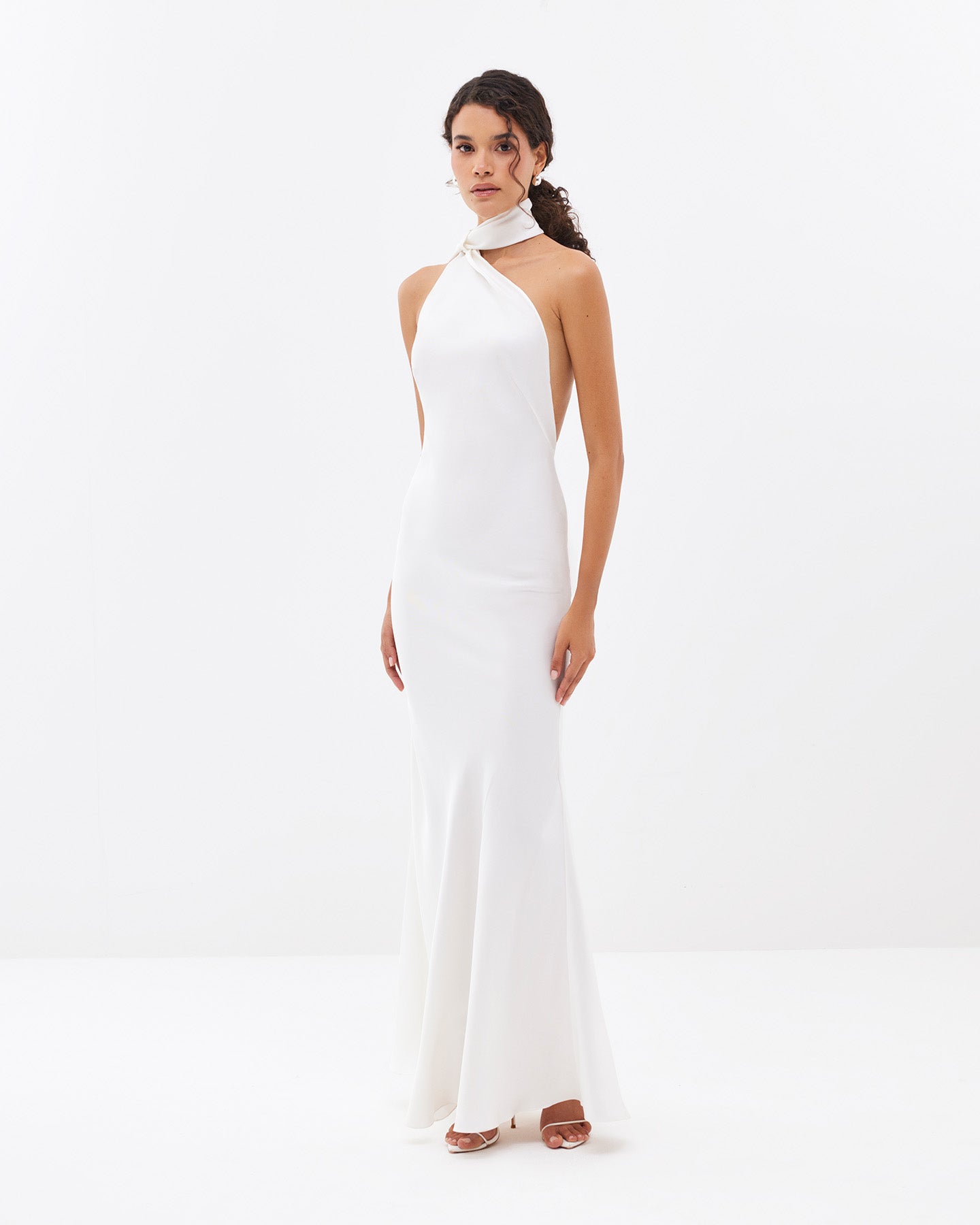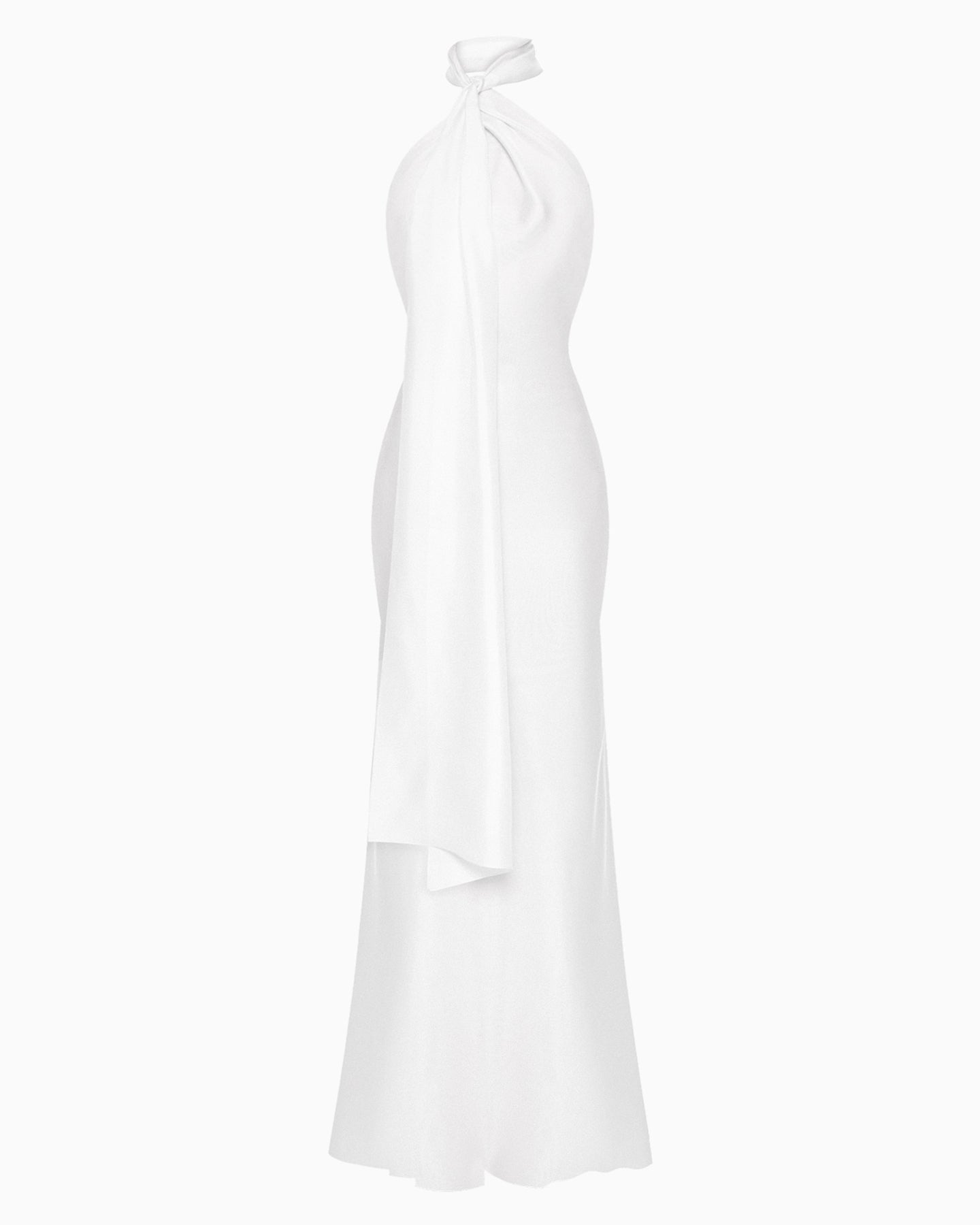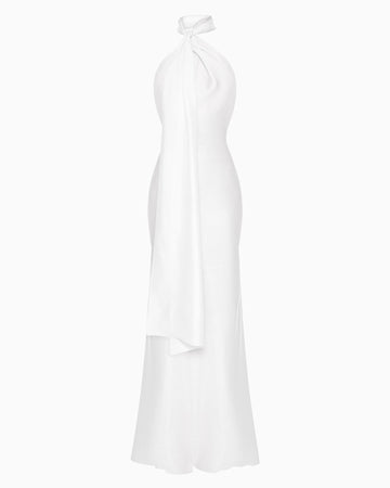 LILIUM symbolizes luxury and romance, inspired by the narrow sunlit streets of Rome. The white silk gently drapes the body, highlighting every line, while the open back and scarf neckline with a train add sophistication and lightness to the look. Perfect for both wedding celebrations and special events.