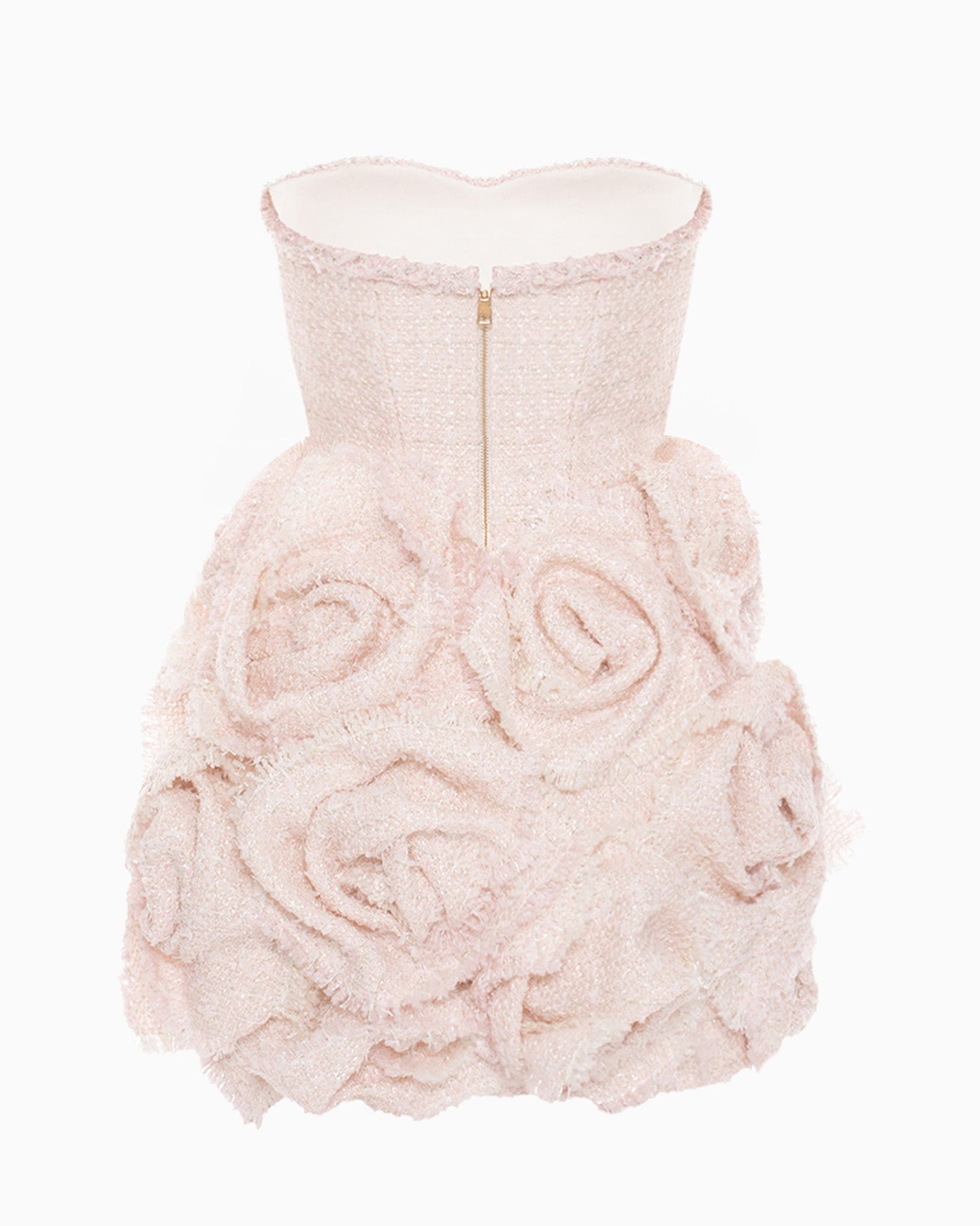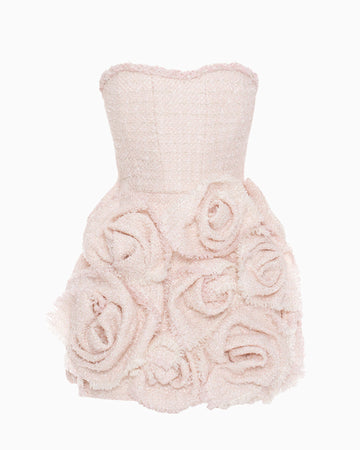 ZINNIA TWEED is the embodiment of romantic femininity. The fitted corset, soft pink tweed with metallic thread, and hand-crafted rose buds create a look that attracts attention and highlights every detail. This mini dress offers effortless elegance and allows you to shine in any situation.