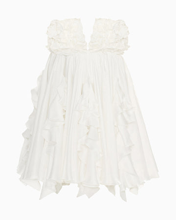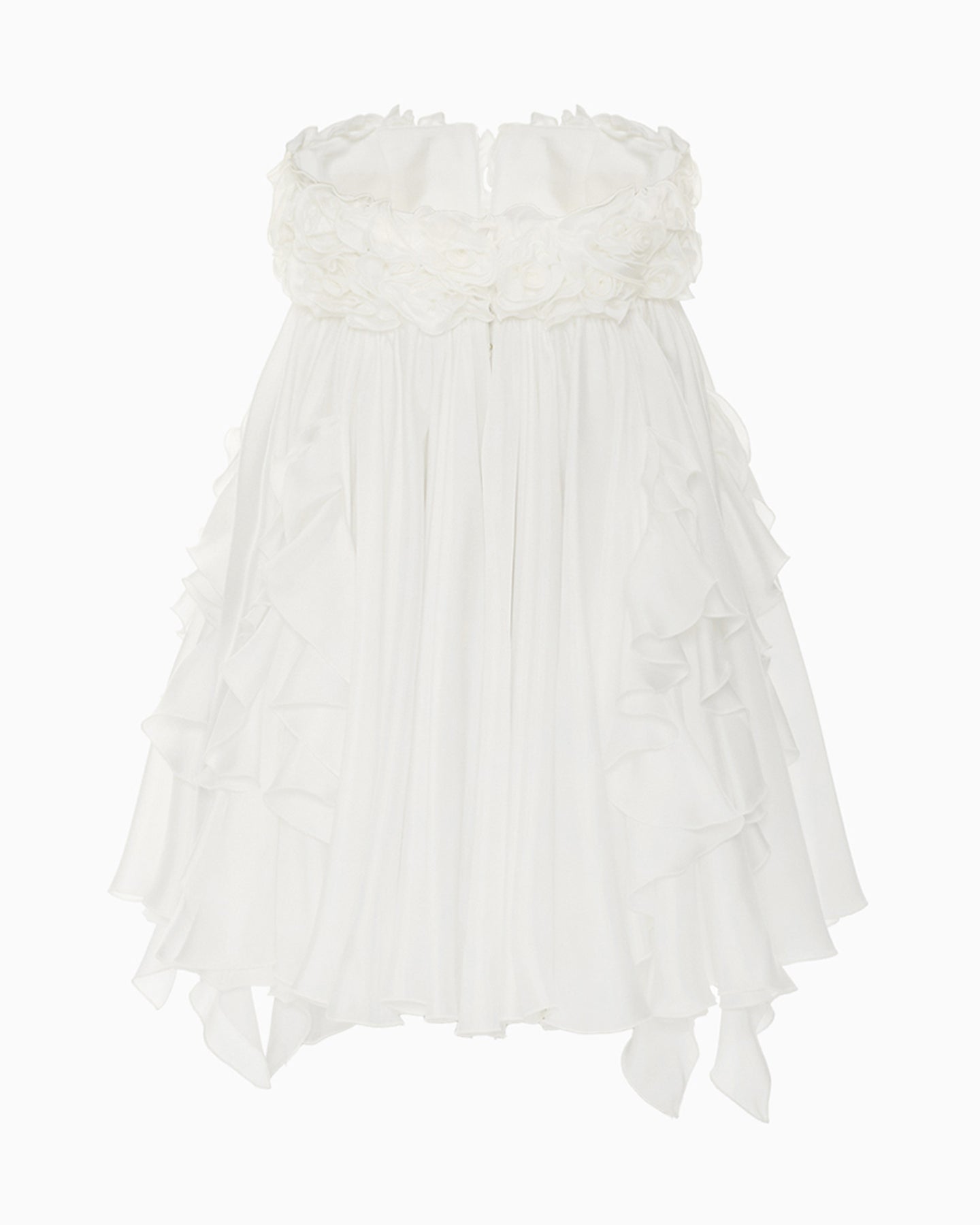 An elegant silk dress with a flowing silhouette and a striking neckline. The ruffles, reminiscent of petals, add an airy touch, while the bodice, designed like rosebuds, enhances its elegance. This dress is the perfect choice for creating a sophisticated and unforgettable look