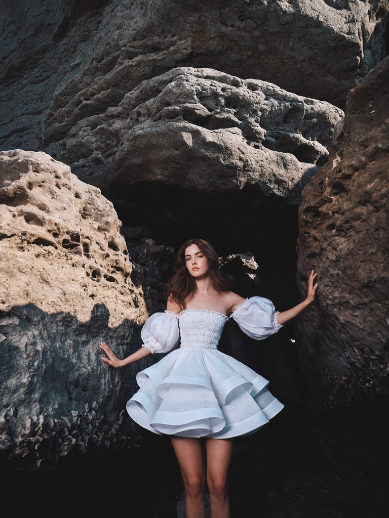 LILIUM symbolizes luxury and romance, inspired by the narrow sunlit streets of Rome. The white silk gently drapes the body, highlighting every line, while the open back and scarf neckline with a train add sophistication and lightness to the look. Perfect for both wedding celebrations and special events.