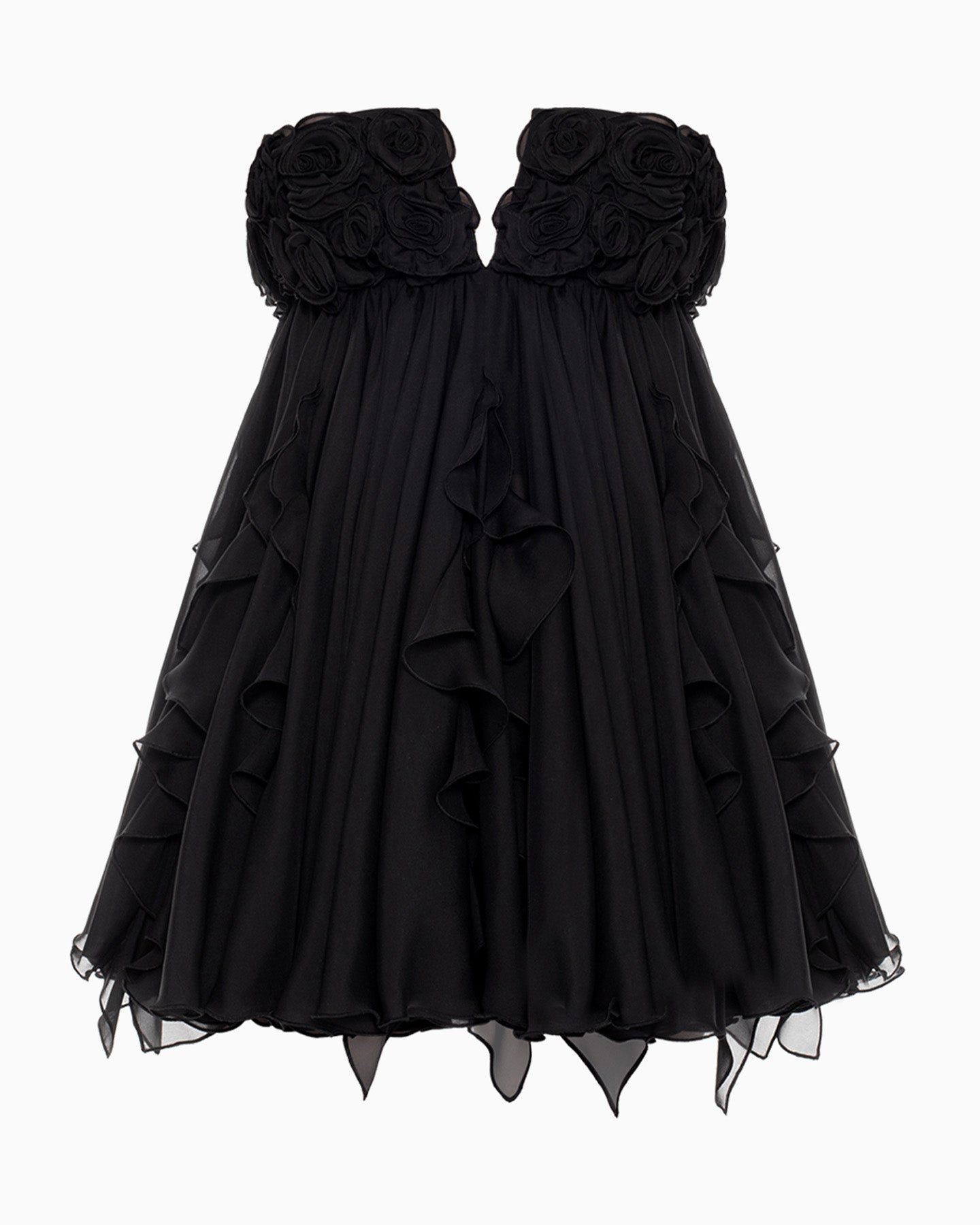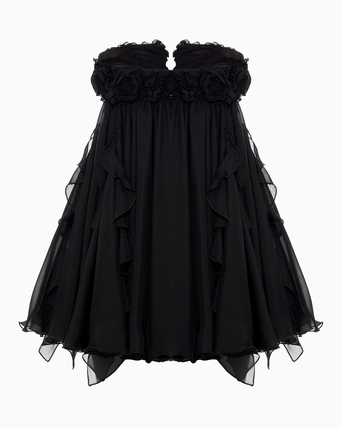 This exquisite dress is made from flowing silk with a billowing silhouette and a striking neckline. Ruffles reminiscent of petals lend an airy quality, while the bodice shaped like rose buds adds elegance. This dress is the perfect choice for creating a sophisticated and memorable look.