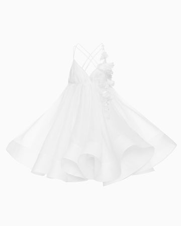 The standout feature of this dress is the delicate flowers attached to the straps — easily removable, so the look can change depending on the mood. This playful detail adds a touch of individuality and makes the dress a versatile choice for both everyday wear and special occasions.