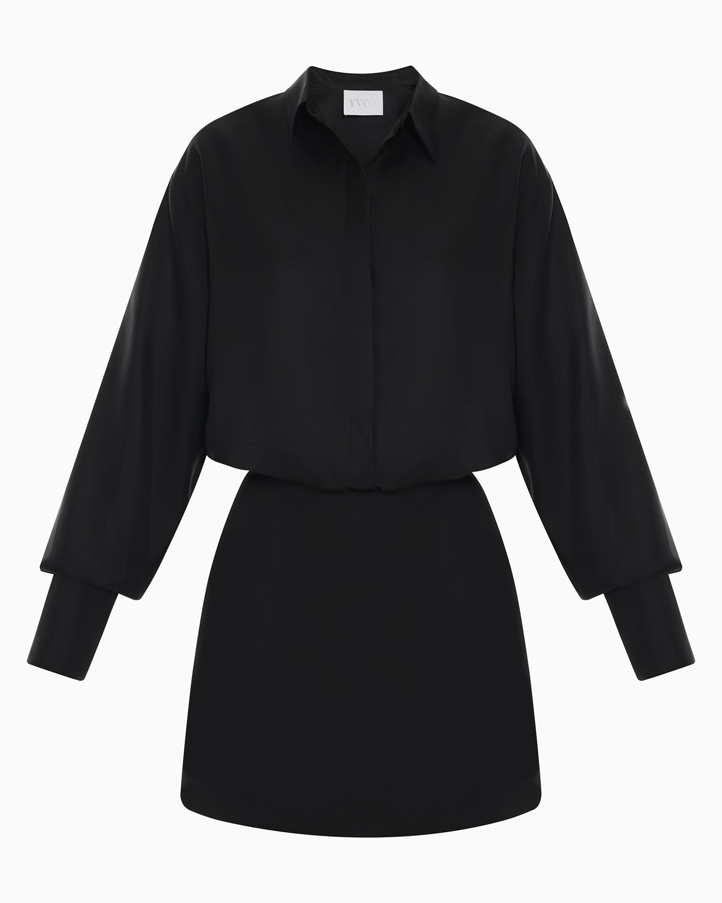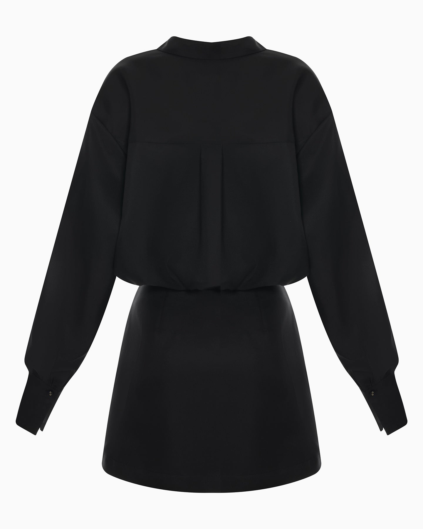 The bodice is designed as a shirt with a neat collar and concealed buttons that allow you to adjust the depth of the neckline. A defined waist creates a flawless silhouette thanks to the precisely tailored cut, while the short skirt elegantly highlights the legs.