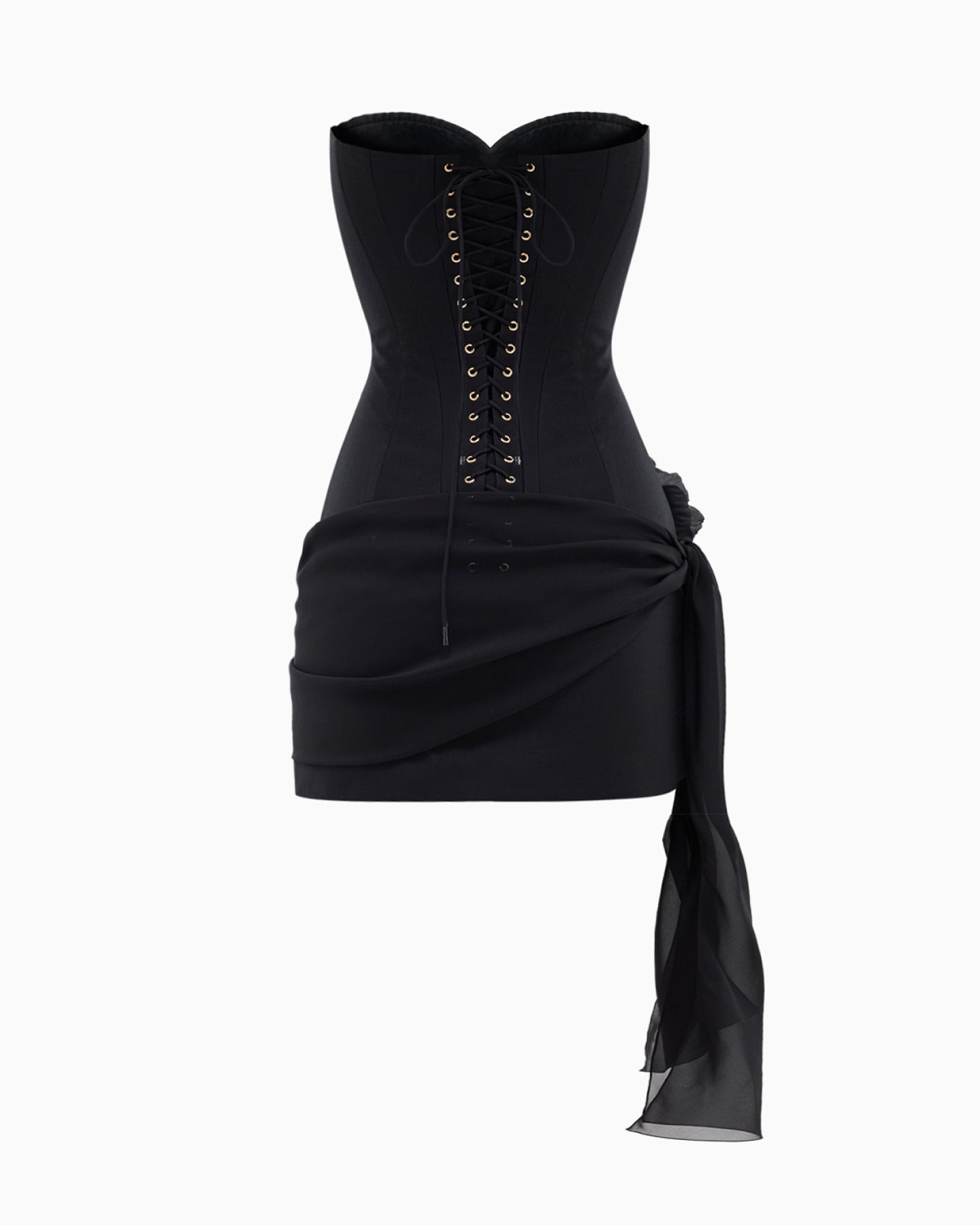 AMBER QUEEN is a black mini dress with an architectural strapless corset bodice and a flawlessly sculpted fit. The draping is crafted from natural silk, while the base combines 52% wool and 48% silk, offering comfortable structure and secure support without any stiffness.