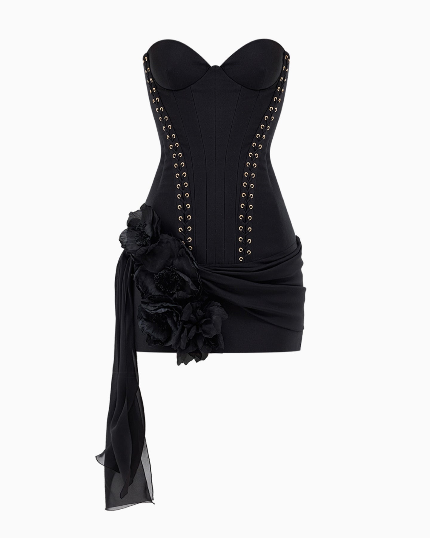 The corset design features precise vertical stitching and metal eyelets that elongate the silhouette and define the waist. An asymmetric silk drape along the hips creates a smooth transition and sets the stage for a large floral embellishment, handcrafted using haute-atelier techniques.