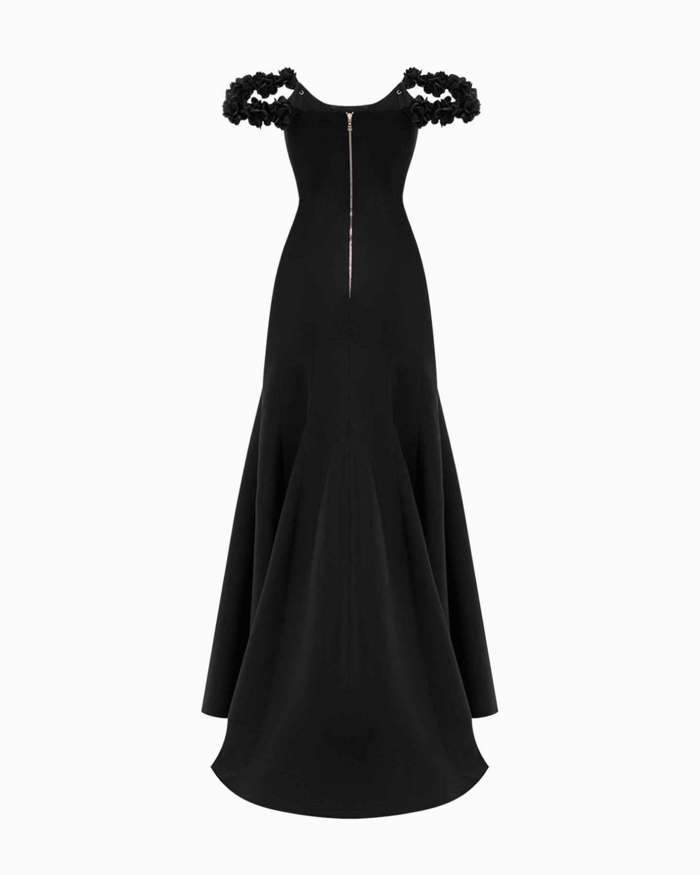 The fitted silhouette highlights the figure, while the maxi length brings an elegant sense of ease. Its signature detail — delicate straps adorned with handmade floral elements — adds a playful, romantic touch and draws attention to the shoulders.