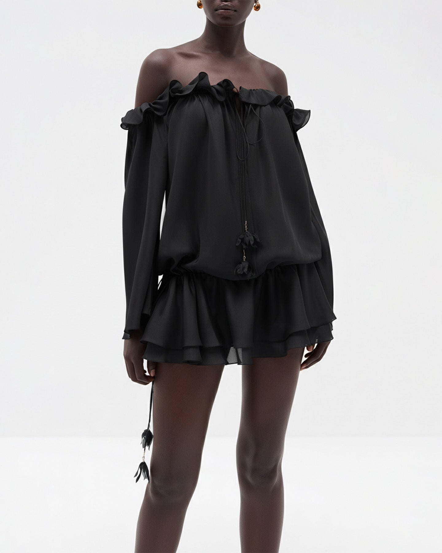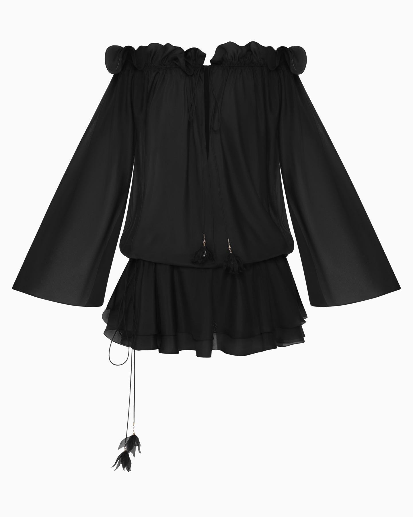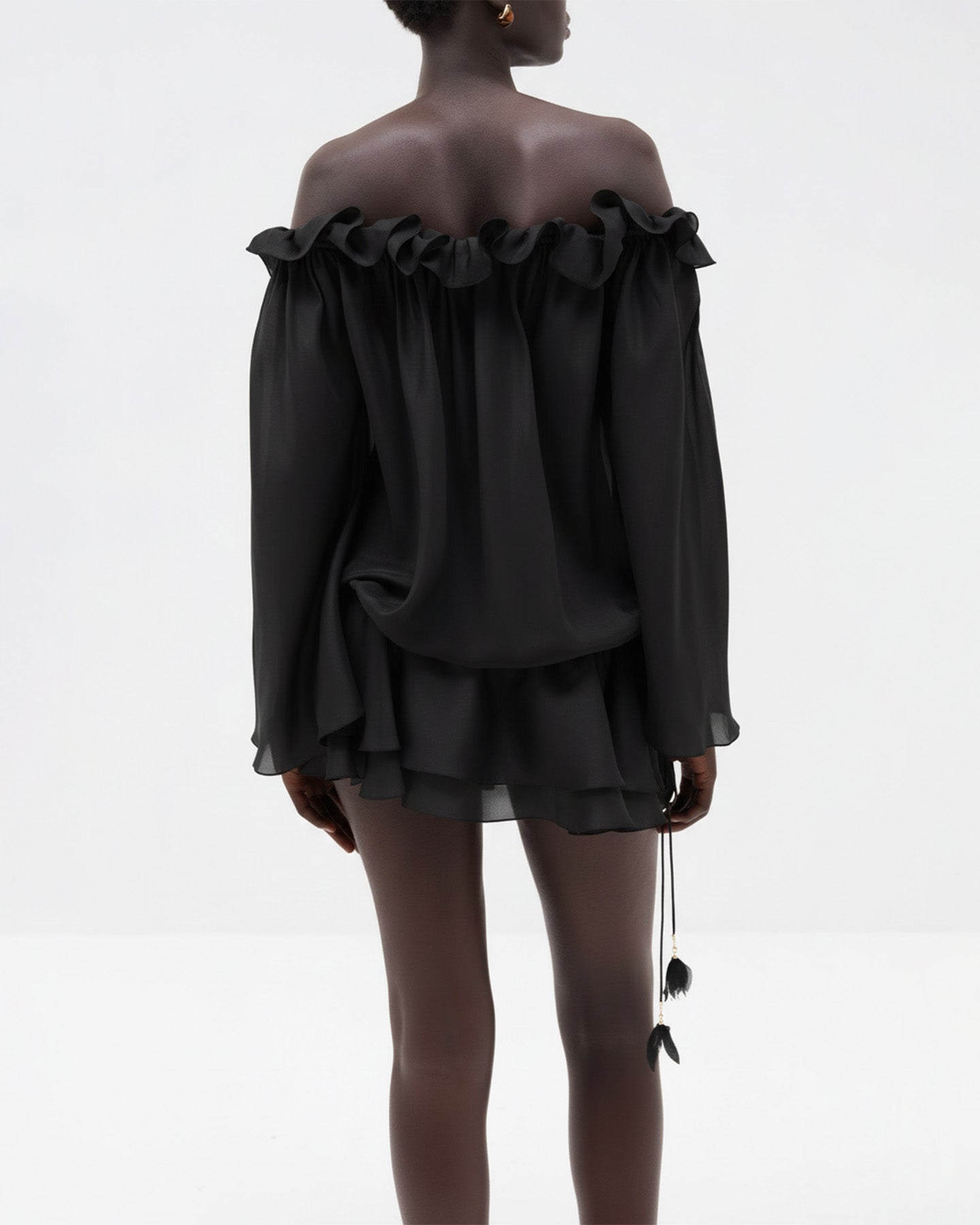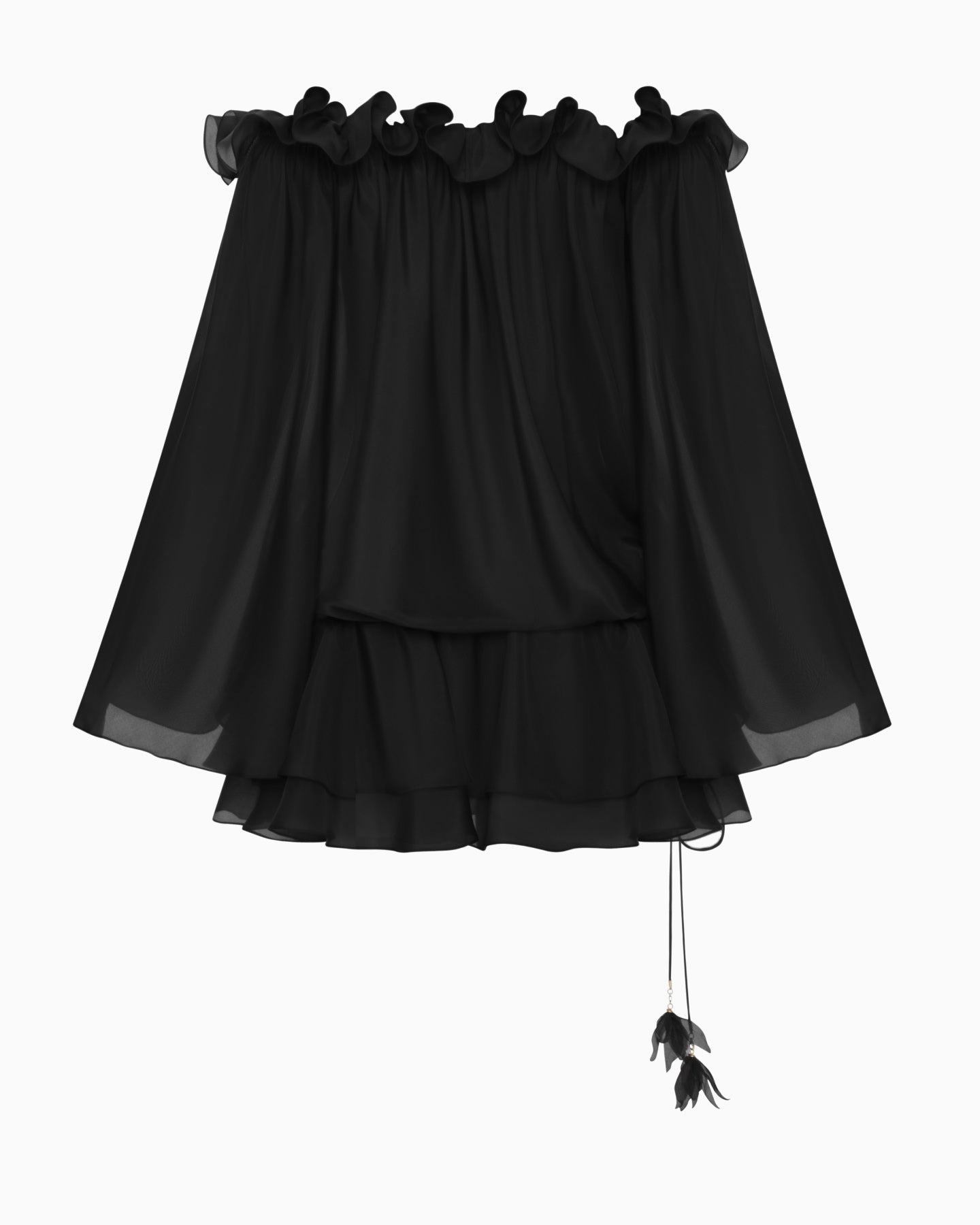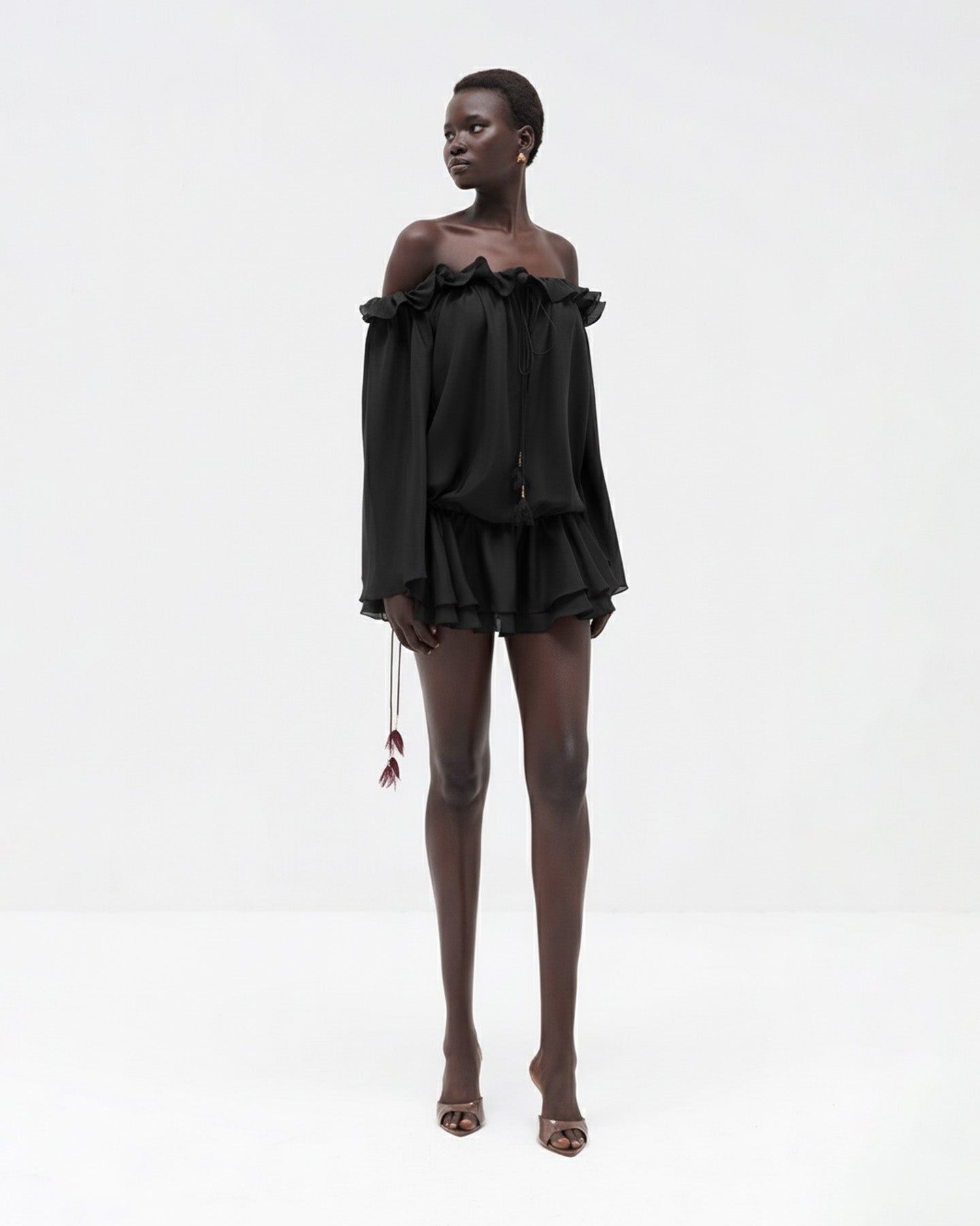 Soft ruffles frame the shoulders, highlighting the collarbones and creating a gentle, romantic line. The double-layered skirt gives the fabric fluid movement with every step. Fine silk ties are finished with detachable handmade flowers, adding a poetic touch to the look.
