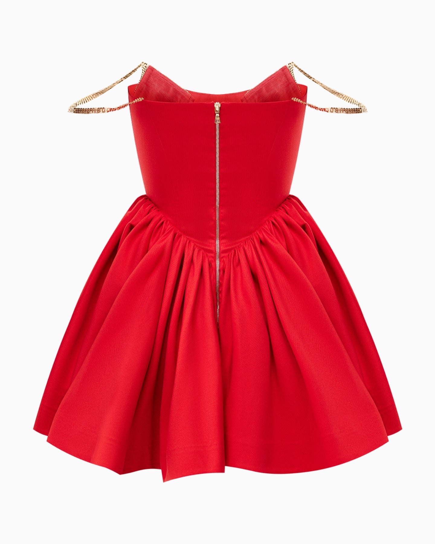 MAREA is a striking cocktail mini dress in a rich, saturated red, crafted from a structured cotton fabric blended with silk.
