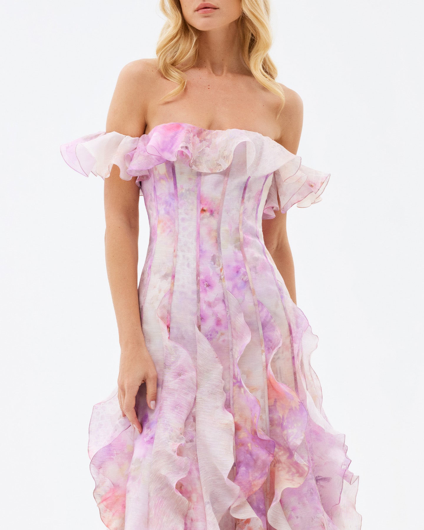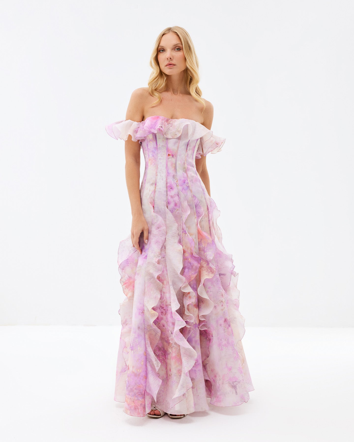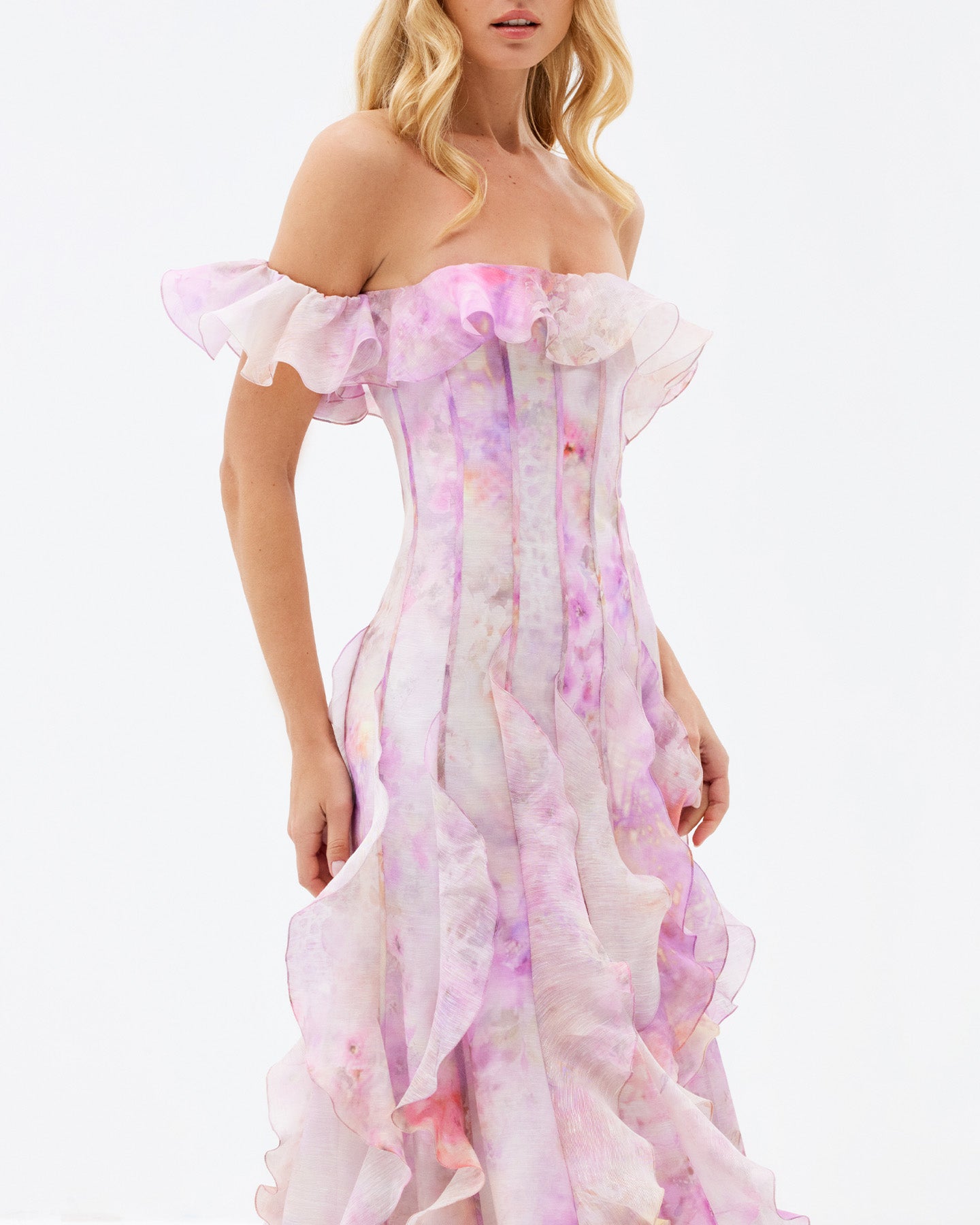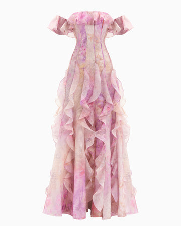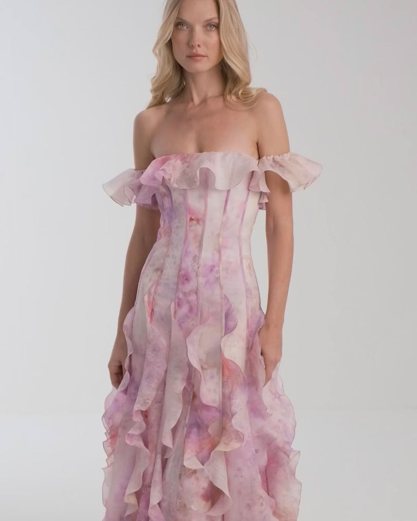 Soft pink tones inspired by Mediterranean blooms wrap gently around this dress, while its delicate silhouette is shaped by a corset-style bodice and wavy details along the off-the-shoulder sleeves and flowing hem. A refined look for those who embrace their softness while making a bold statement. It's the perfect foundation for an unforgettable outfit—whether for a dreamy daytime stroll or a magical evening. Pair it with a chic hat by the sea, then switch to bold earrings for a sunset soirée.