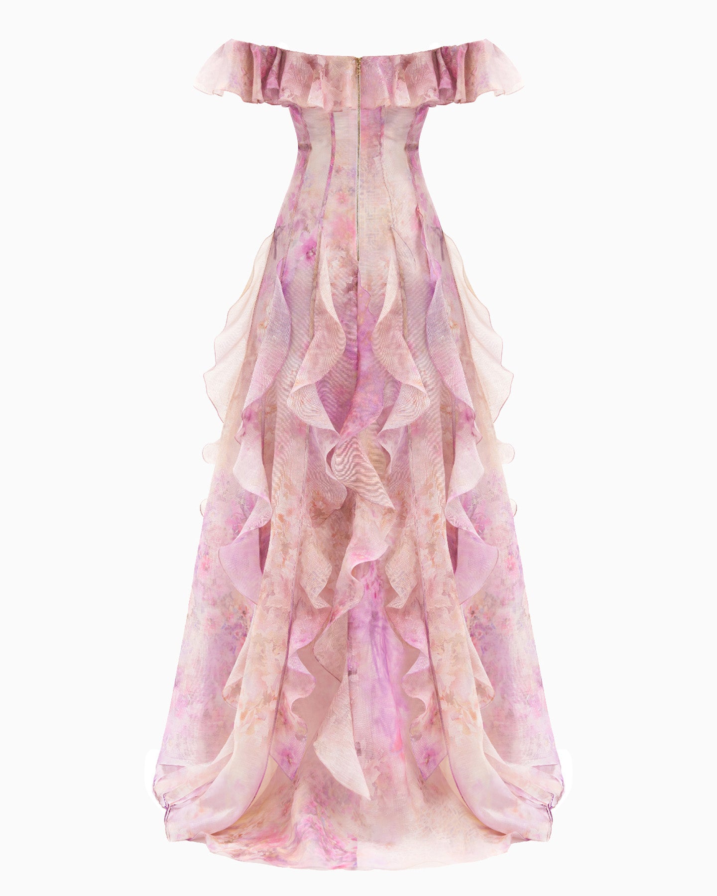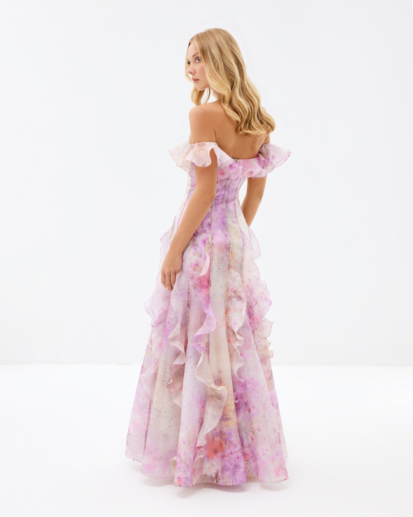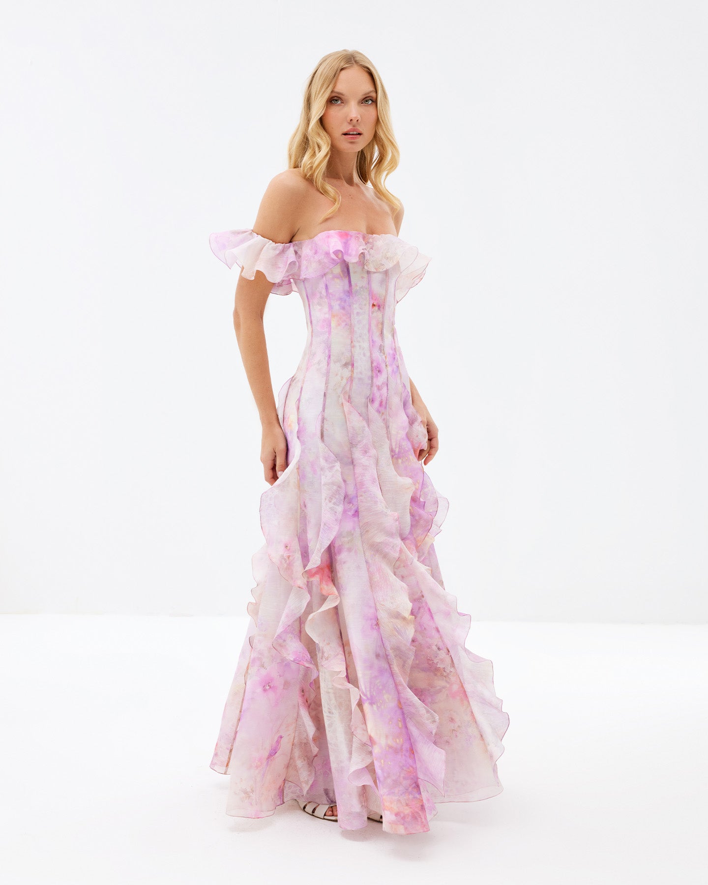Soft pink tones inspired by Mediterranean blooms wrap gently around this dress, while its delicate silhouette is shaped by a corset-style bodice and wavy details along the off-the-shoulder sleeves and flowing hem. A refined look for those who embrace their softness while making a bold statement. It's the perfect foundation for an unforgettable outfit—whether for a dreamy daytime stroll or a magical evening. Pair it with a chic hat by the sea, then switch to bold earrings for a sunset soirée.