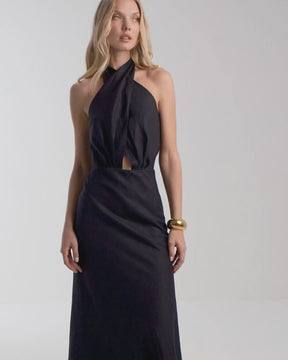 A dress in the deep shades of a dark Moroccan night. The fitted, maxi-length skirt with a bud-inspired silhouette pairs beautifully with a halter neck top and bare shoulders. Made from breathable linen fabric, this dress is perfect for hot weather, keeping you comfortable in any heat. Explore the world without worrying about the details-wearing YVON means you’re ready for a stylish day out.