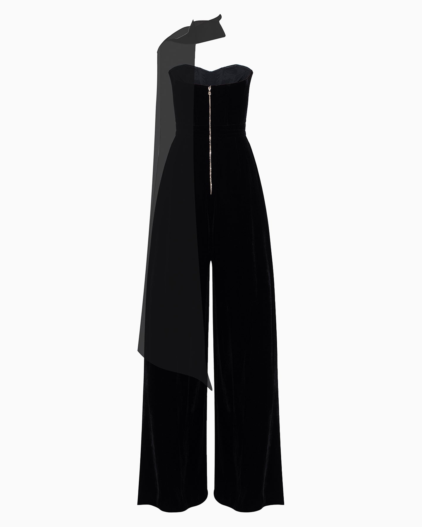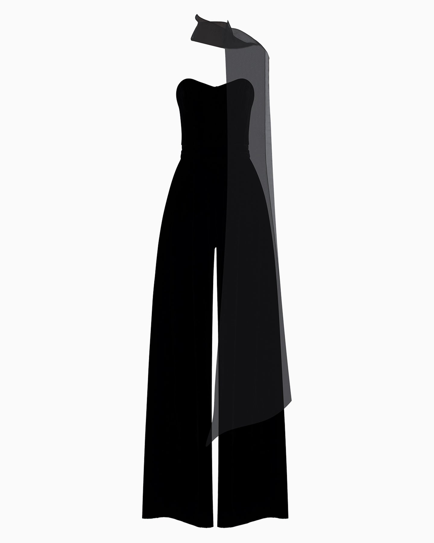 As a special addition, the jumpsuit comes with a weightless silk veil that can be elegantly draped over your shoulders, tied in a bow at the neck, or cinched at the waist.