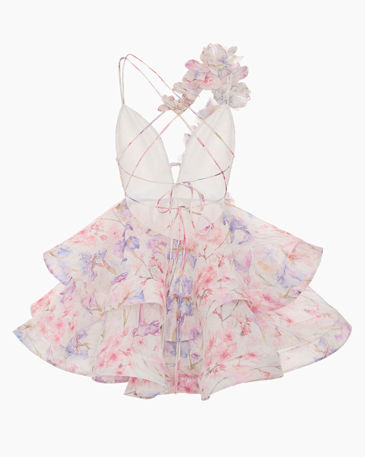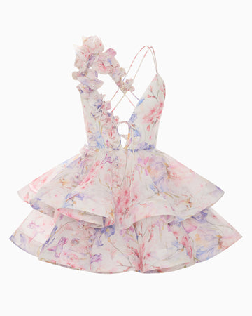The embodiment of grace, lightness, and femininity. Handcrafted flowers adorn the bodice and cascade onto the back, giving the dress its exquisite refinement. An original floral print on premium linen-silk, combined with full crinoline skirts, creates an ethereal sense of weightlessness. Delicate straps and an open back enhance every movement.