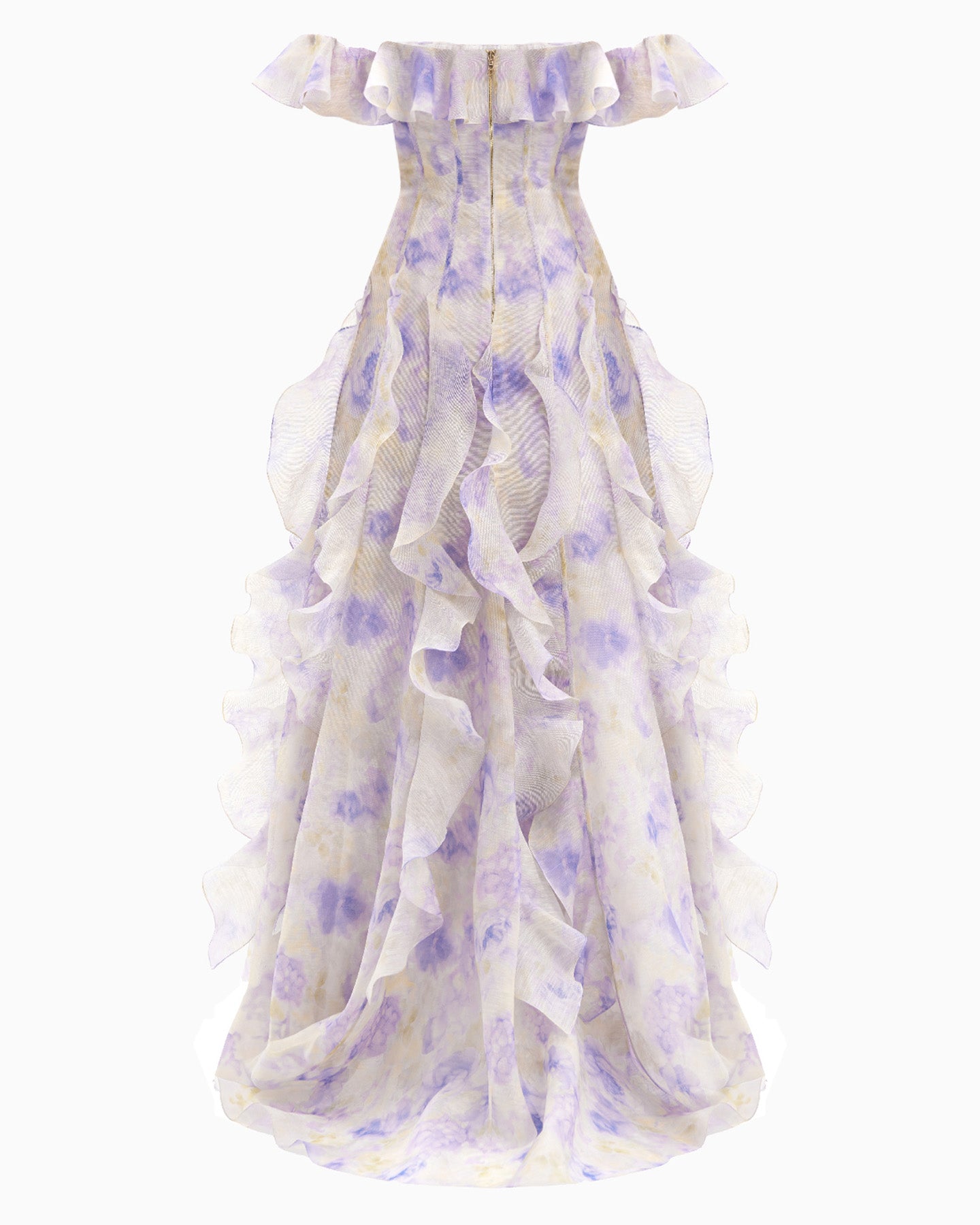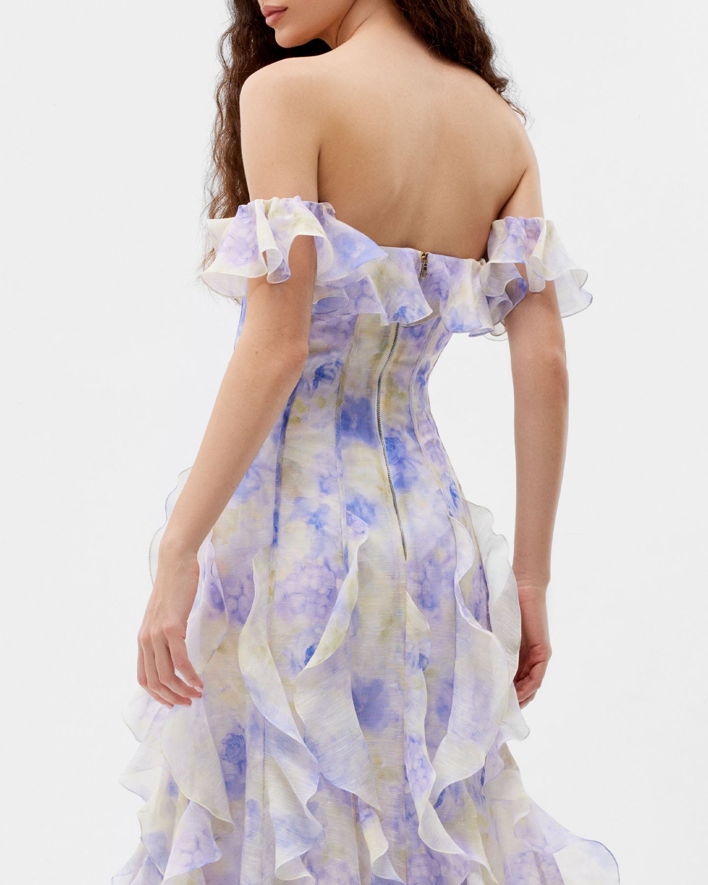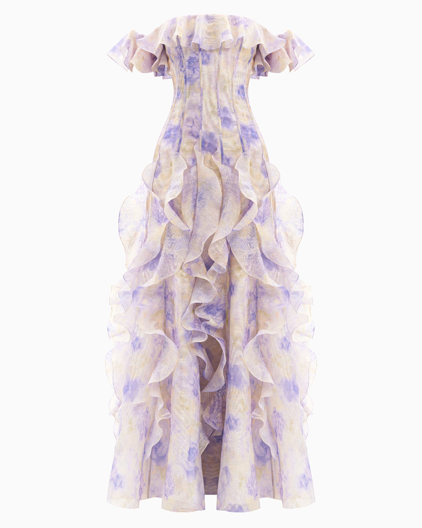 Crafted from luxurious linen-silk fabric and adorned with cascading ruffles, the Cour de Marie Dress commands attention with its dramatic silhouette.