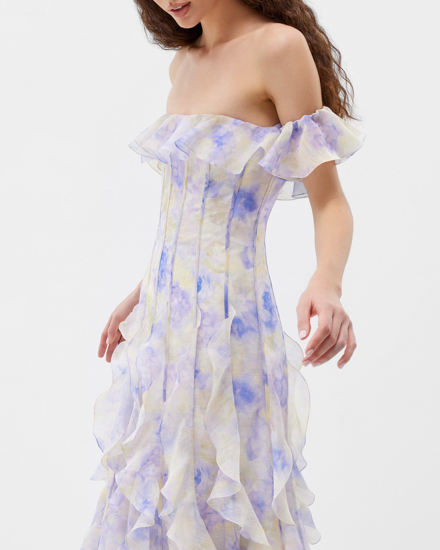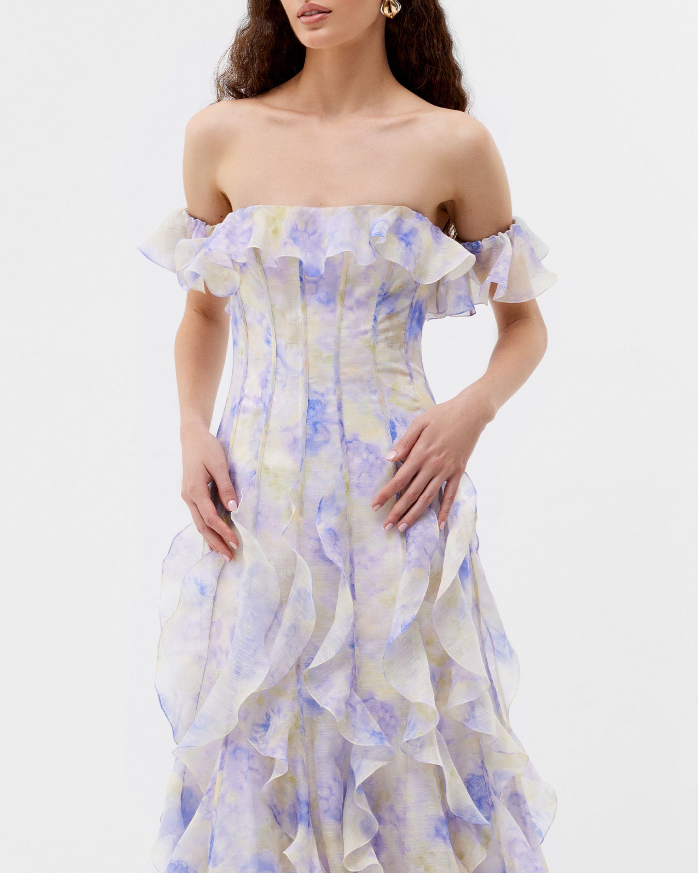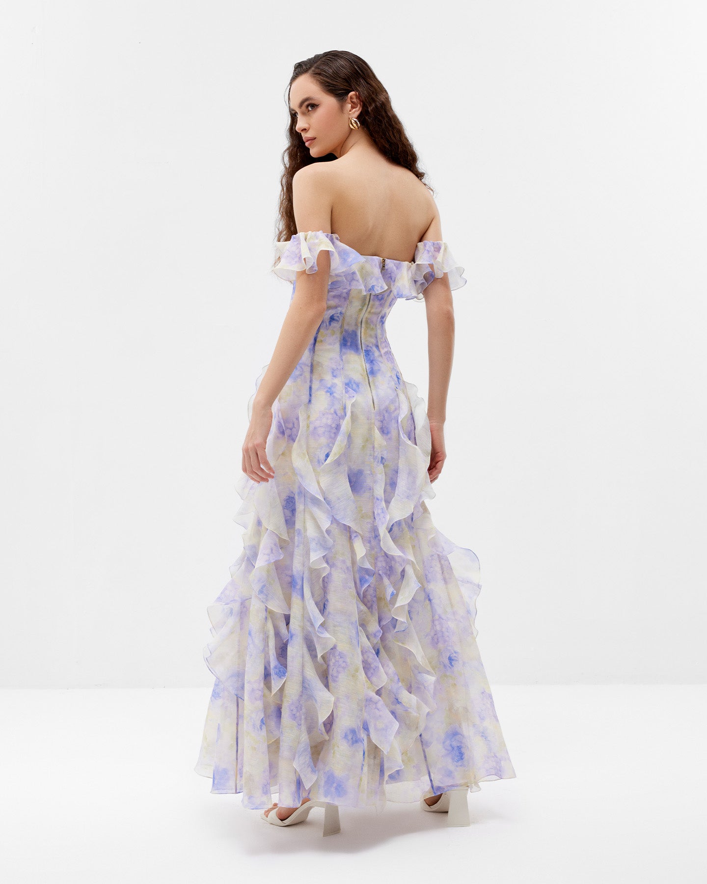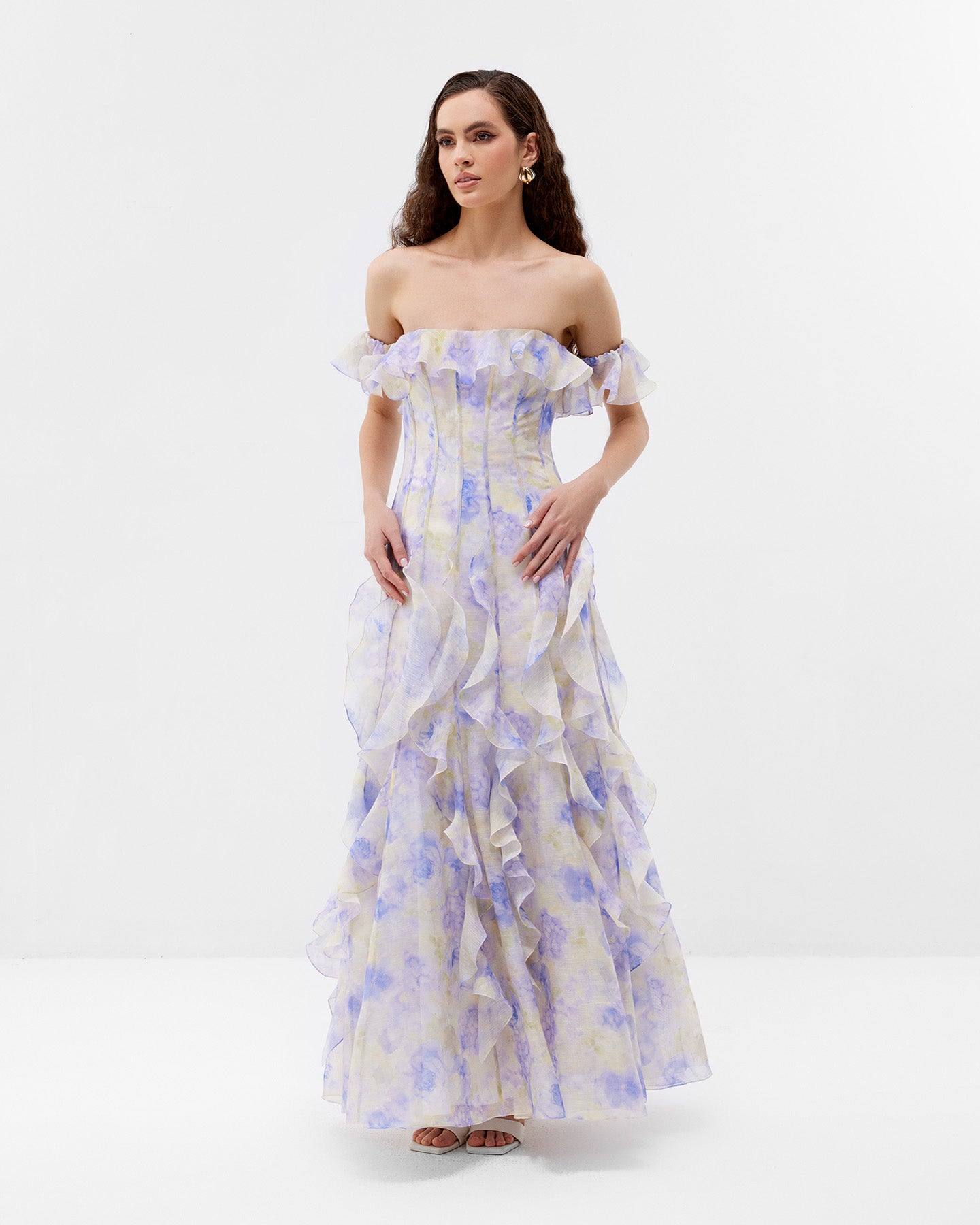 A structured corset bodice, fitted waist, and flowing maxi length bring an air of refinement and grace.