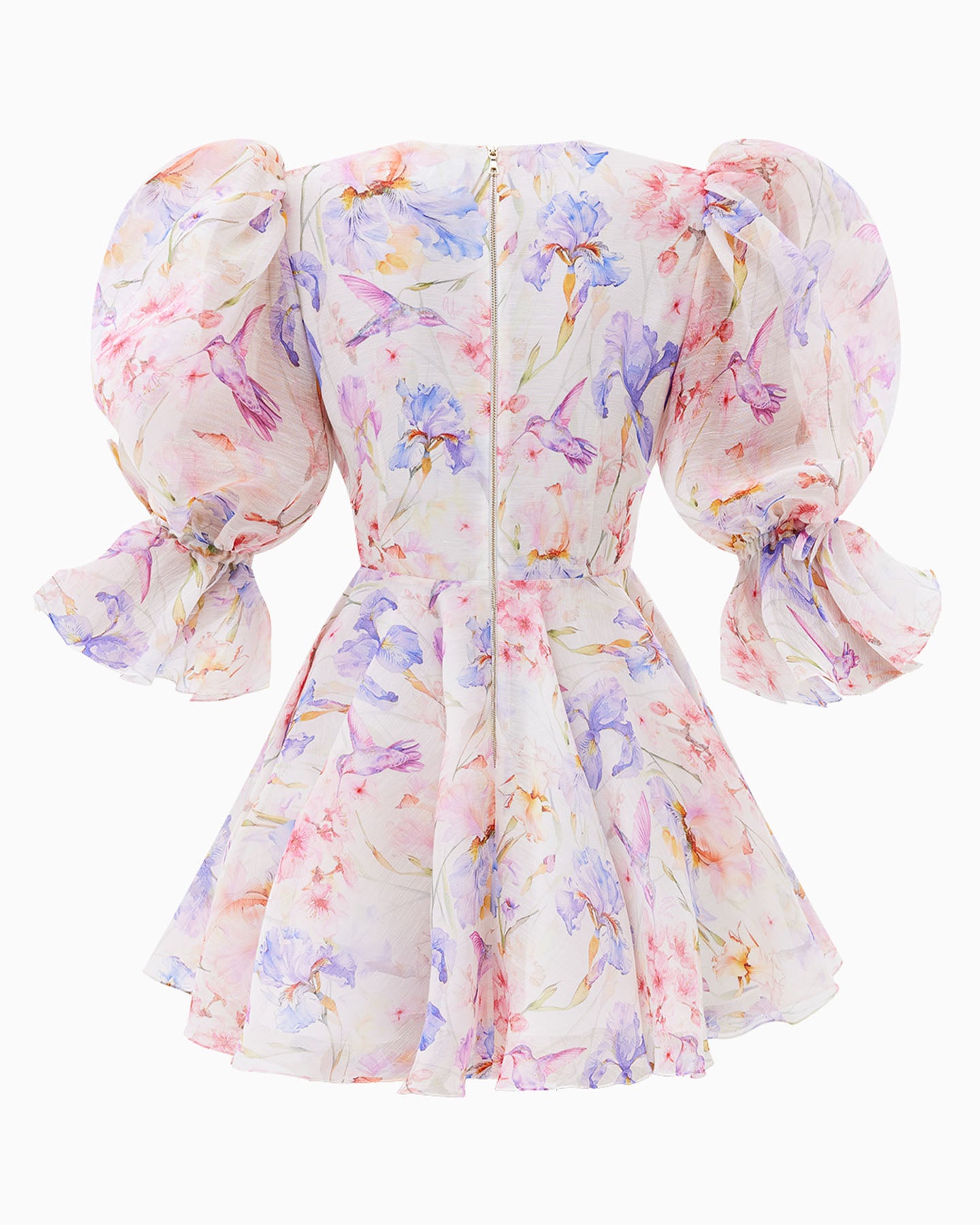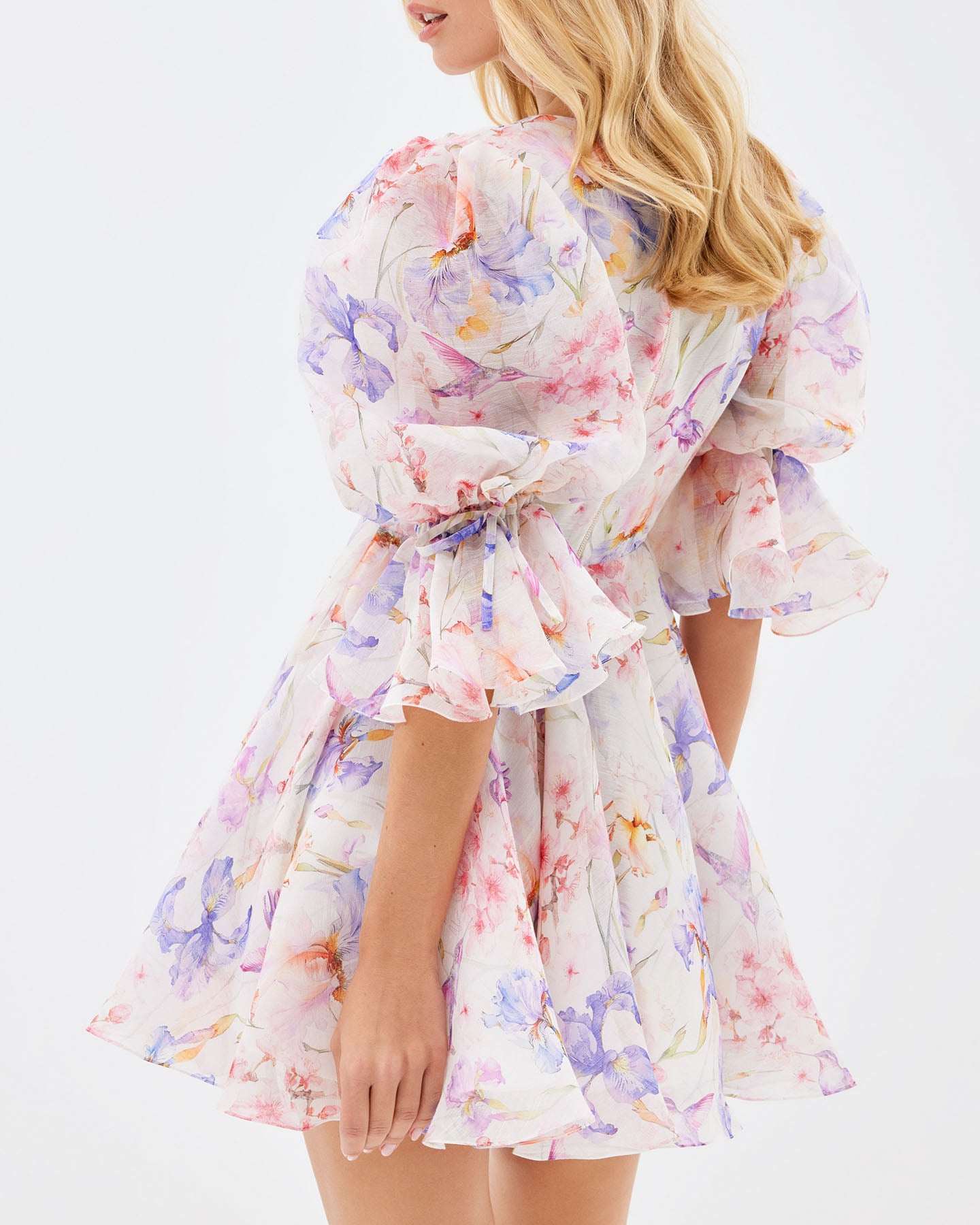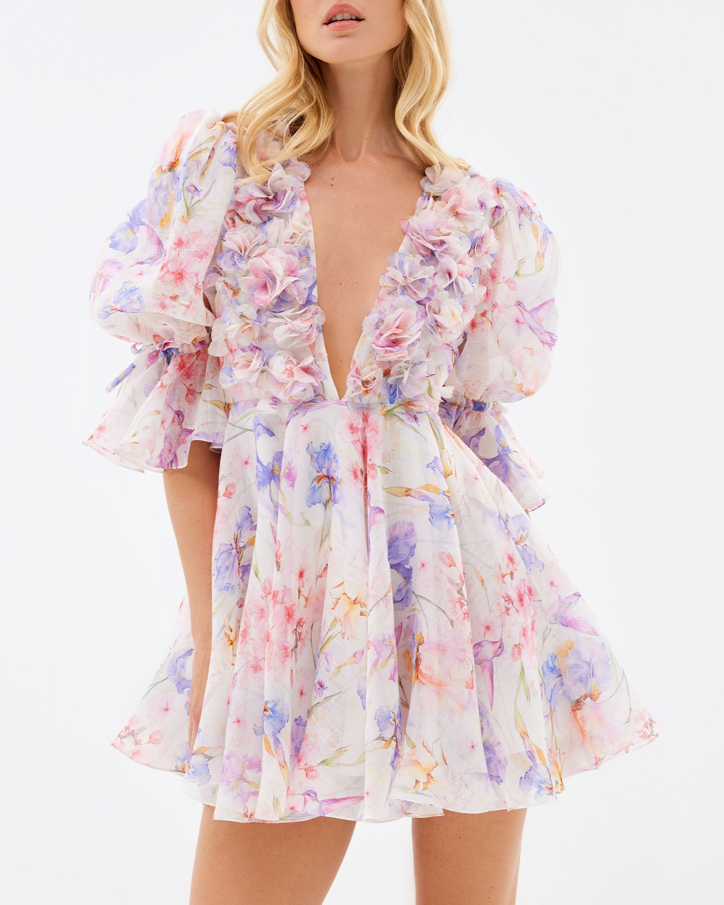 A delicate expression of romance with a touch of Italian charm. The deep neckline, fastened with a dainty button, lets you shift the focus — wear it demure or make it daring. Voluminous puff sleeves add a sense of lightness and ease, perfectly balancing the full skirt that flows into a graceful silhouette. Handcrafted floral details bring a unique, one-of-a-kind charm to the piece. DIGITALE is made for those who seek harmony between elegance and individuality.