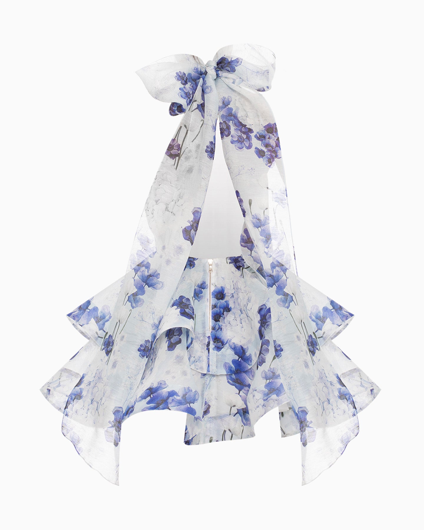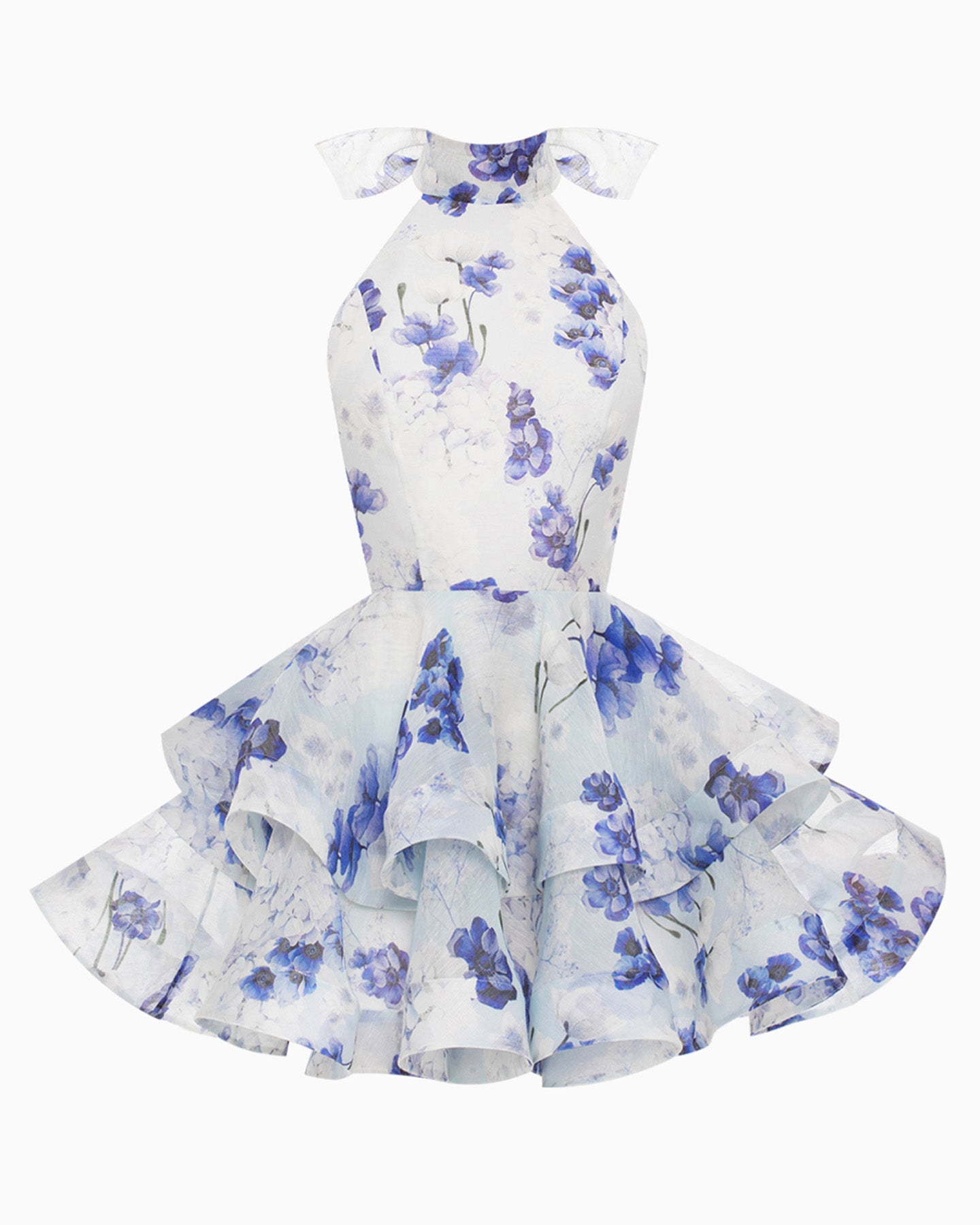 E’TOILE BLEUS — your perfect dress for a special occasion or a party. A romantic double-layered mini skirt in the shape of a flower, paired with a voluminous removable bow. Elegance and refined femininity are enhanced by the open back and American armholes with a stand-up collar. The dress is made from premium linen-silk fabric featuring a floral print of rare, fantastical blue and turquoise poppies in stunning shades
