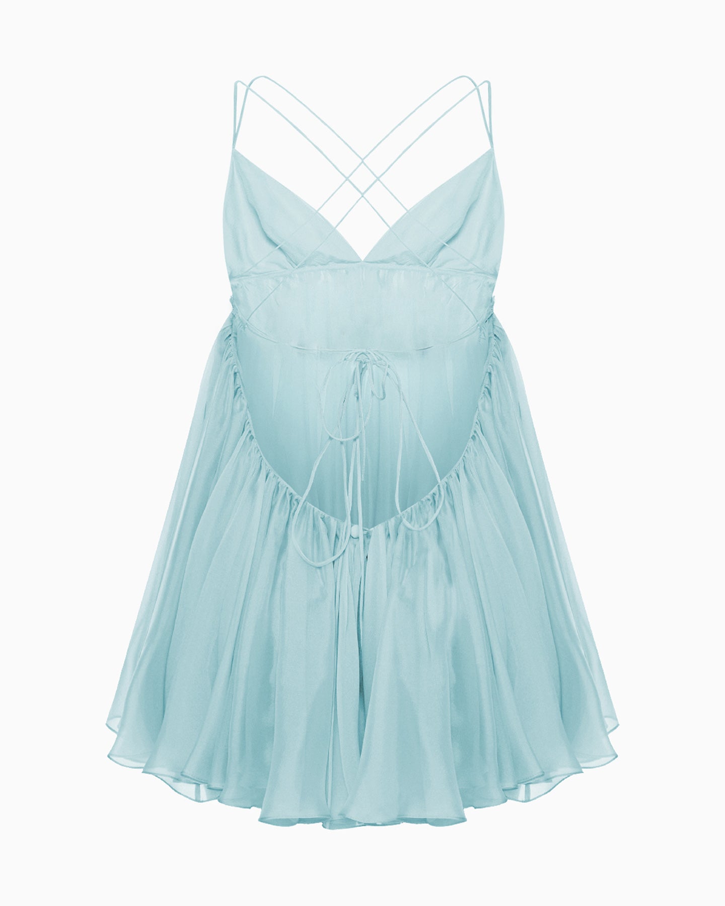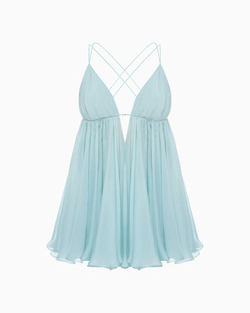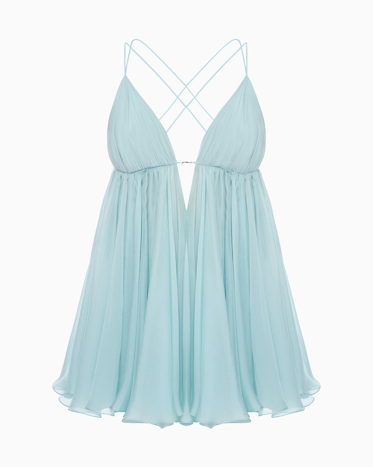 An open back, hand-gathered bodice, and billowing skirt that flutters in the wind make it the perfect piece for creating effortlessly beautiful looks.