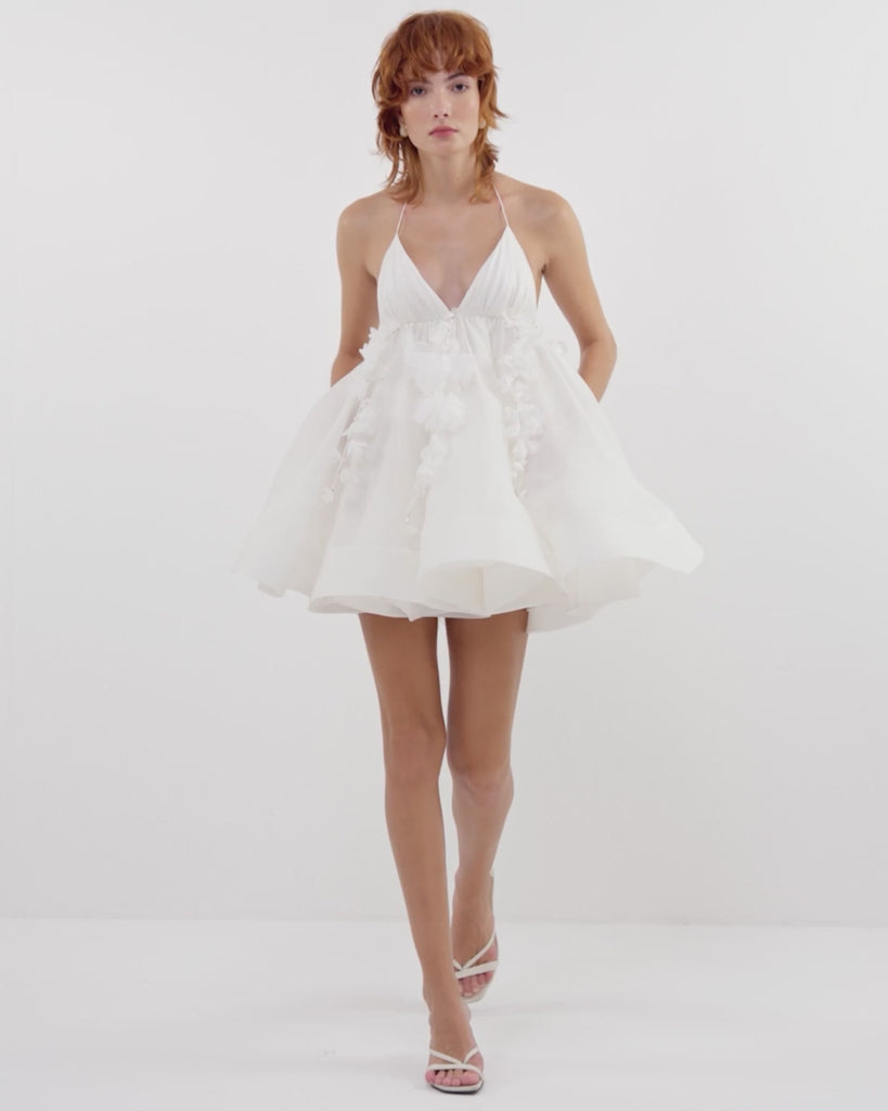 A bodice with delicate straps and an open back creates a romantic, playful silhouette, while a signature detail — flowers gracefully fastened beneath the bodice — cascade gently, adding refinement and softness to the look.