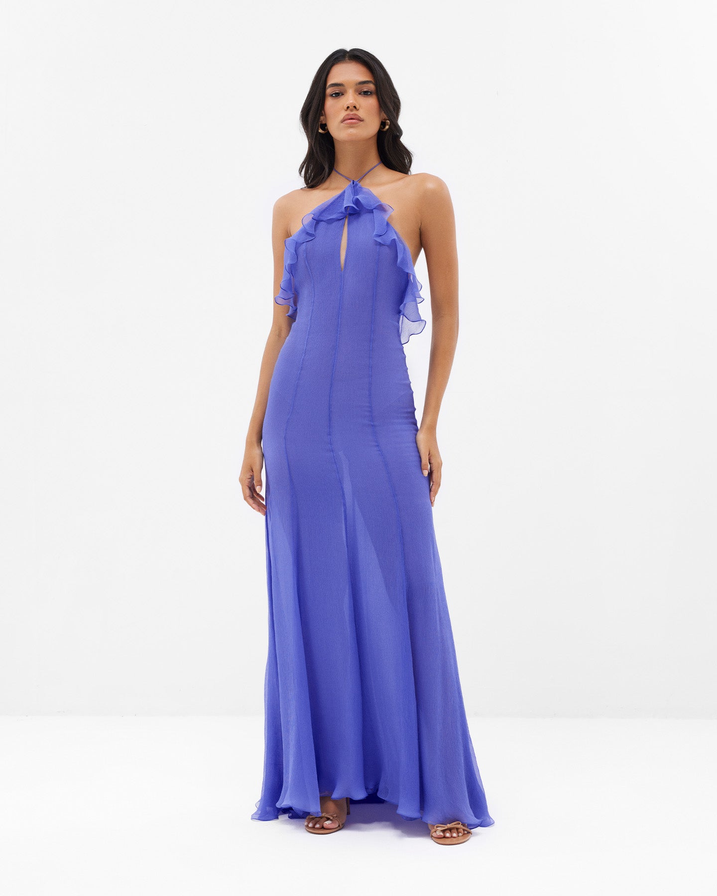 Crafted from two layers of whisper-light chiffon, this gown drapes beautifully over the body, accentuating every movement with effortless grace.